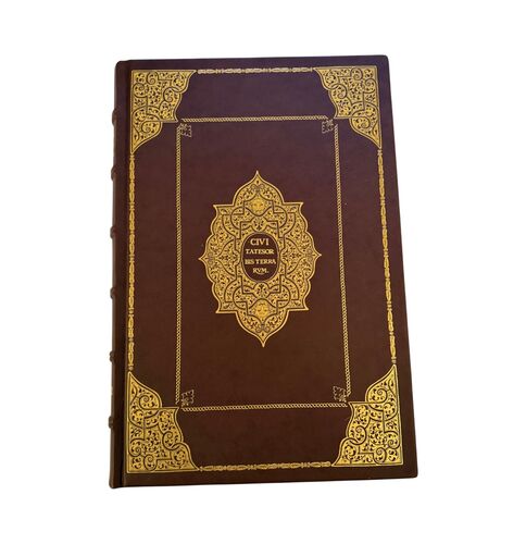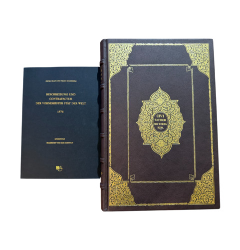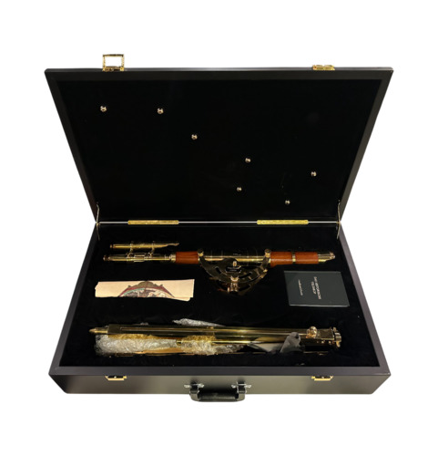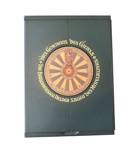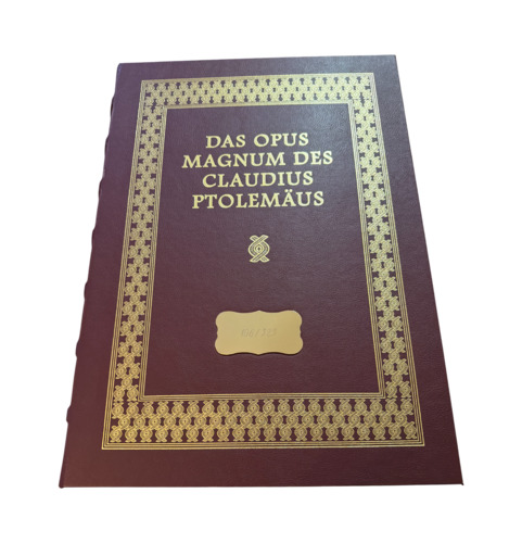 Jedes Blatt ist in einem hochwertigen Passepartout präsentiert. Die Kassette selbst trägt als Zierstück eine echtvergoldete Messingscheibe nach dem Vorbild einer astrologischen Tafel aus dem Ptolemäus-Handtafel-Codex.