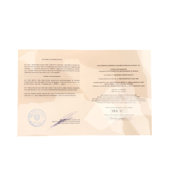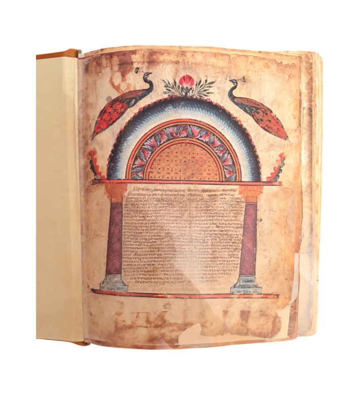 Der Codex Etschmiadzin, geschrieben 989 im Kloster Noravank in Armenien, zählt zu den bedeutendsten Evangelienhandschriften der Welt. Er überliefert den Text der altarmenischen Bibelübersetzung des 5. Jahrhunderts, die wegen ihrer Genauigkeit und sprachlichen Reinheit als „Königin der Bibelübersetzungen“ gilt.