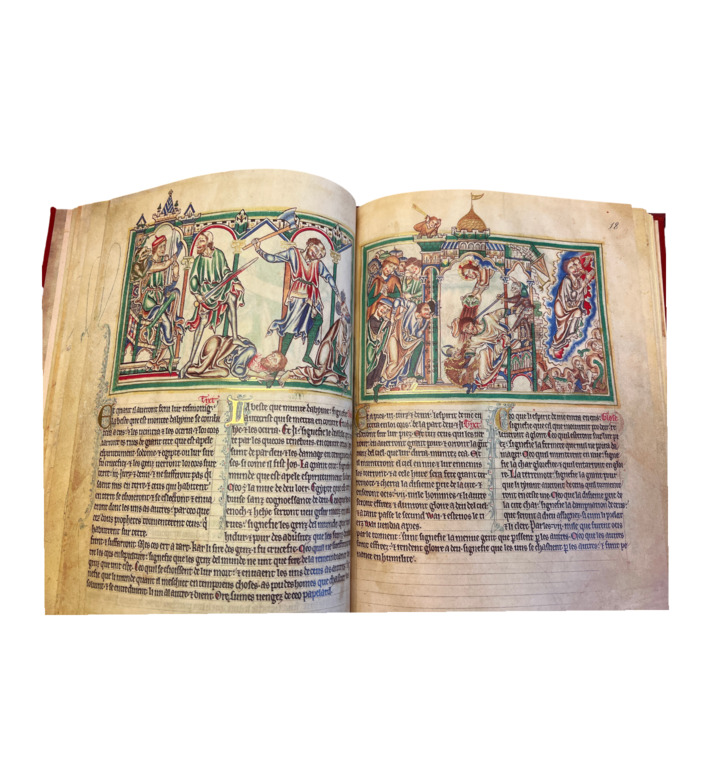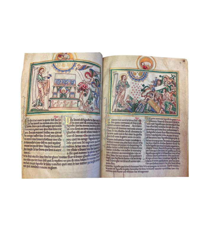 Auf 100 reich verzierten Seiten entfaltet sich ein Zyklus von Miniaturen, die den Text der Offenbarung des Johannes in leuchtenden Farben und mit großzügigem Goldschmuck illustrieren. Jede Szene ist in fein komponierten Registern angelegt, gerahmt von grün-goldenen Ornamentbändern. Die anmutigen, gotisch verfeinerten Figuren kontrastieren mit den dramatischen Visionen der Apokalypse – ein faszinierendes Spannungsverhältnis von Schönheit und Schrecken.