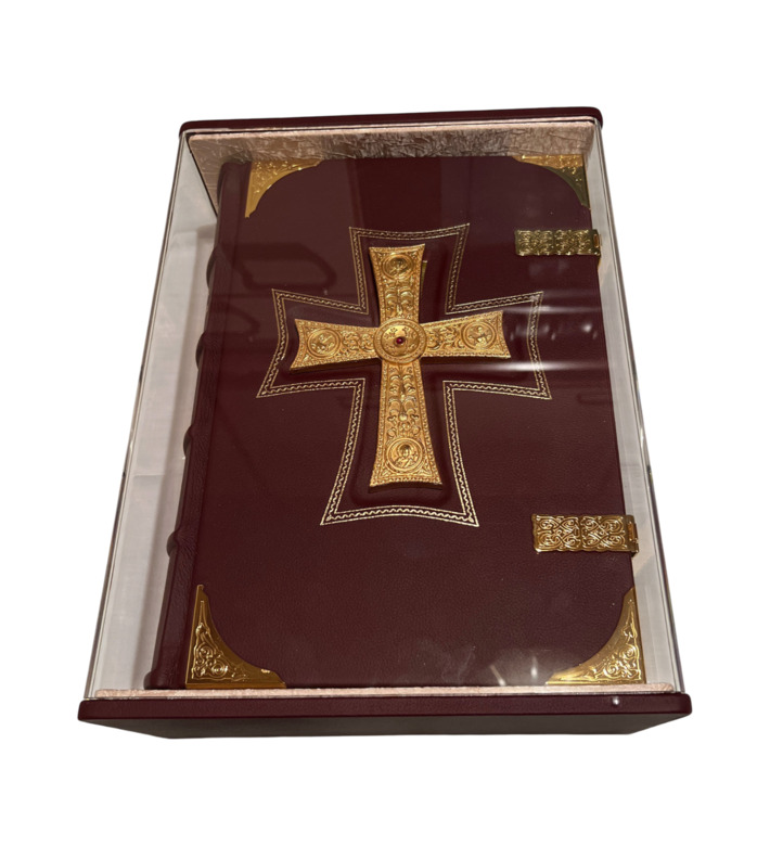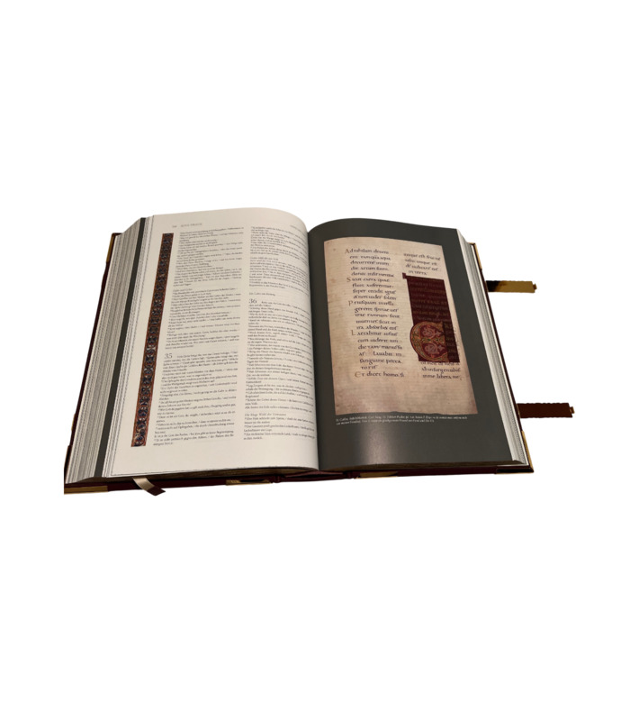 Die luxuriöse Ausstattung umfasst punzierten Goldschnitt, einen Ledereinband mit vergoldeten Schließen und ein abnehmbares Kreuz mit Rubin. Ein persönliches Vorwort von Papst Franziskus betont zudem die geistliche Dimension dieser einzigartigen Bibel.