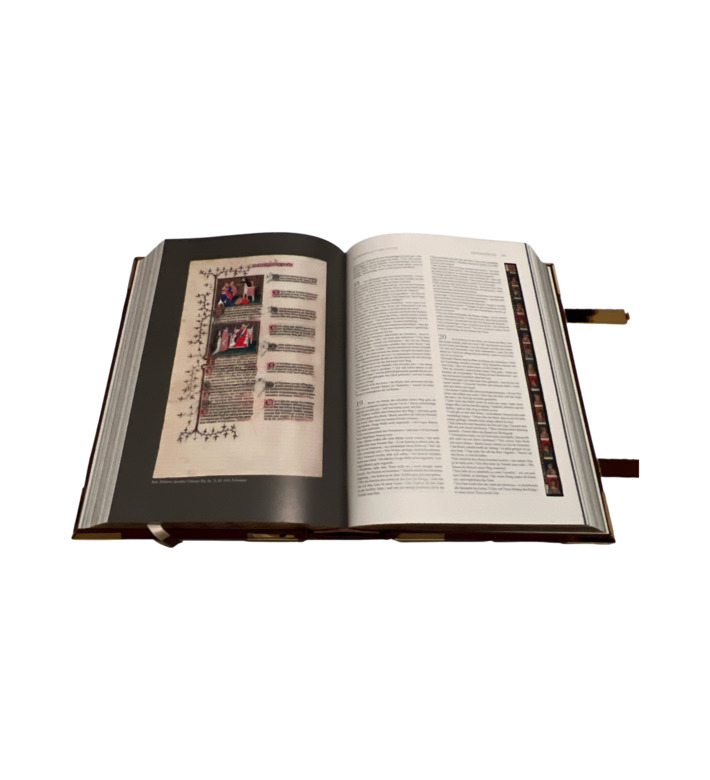 Die Illustrationen stammen aus mehr als 40 berühmten Handschriften aus zehn Jahrhunderten Buchmalerei – darunter das ottonische Strahov-Evangeliar, der romanische Albani-Psalter, die gotische Hamilton-Bibel oder die prachtvolle Renaissance-Bibel des Federico da Montefeltro. Durch diese Vielfalt bildet die Ausgabe ein beeindruckendes Panorama der christlichen Kunstgeschichte.
