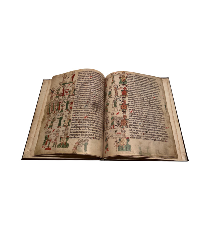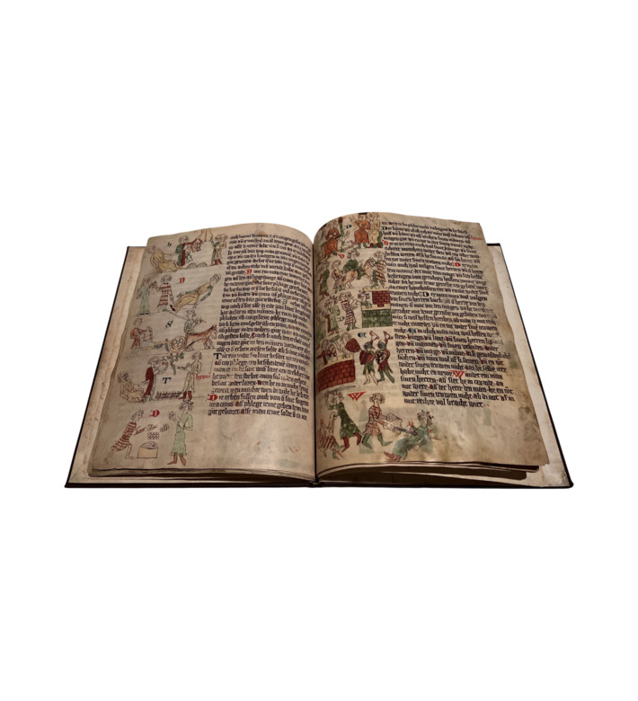 Der Heidelberger Sachsenspiegel gehört zu den bedeutendsten Rechtsquellen des Mittelalters und bewahrt eine der frühesten Fassungen des großen Rechtsbuchs Eike von Repgows. Entstanden zwischen 1295 und 1304 im nordöstlichen Harzgebiet, vereint der Codex eine außergewöhnlich enge Verzahnung von Text und Bild. Die lebendigen Illustrationen übersetzen die komplexen Rechtsnormen des Land- und Lehnrechts in eindrucksvolle Bildsequenzen, deren übergroße Gestik, präzise Gegenstände und klare Szenenfolge bis heute faszinieren.