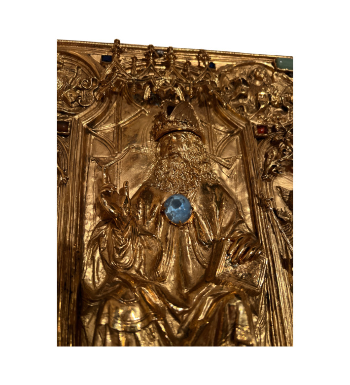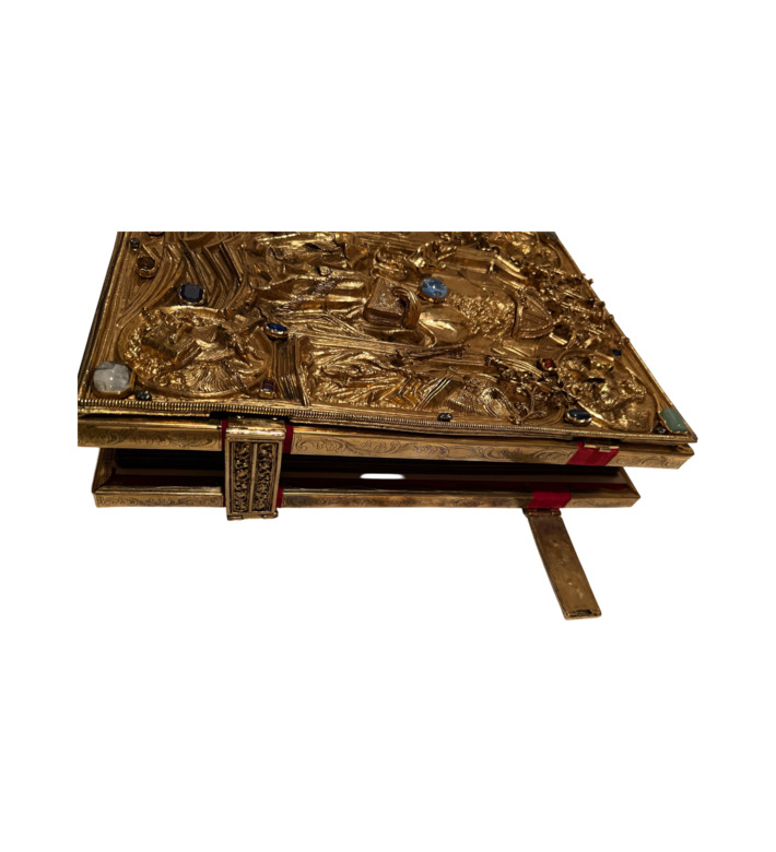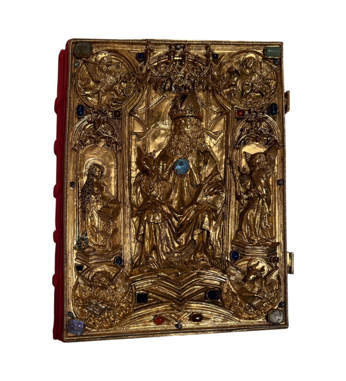 Der spätere Einband von Hans von Reutlingen, um 1500 geschaffen, erhebt die Handschrift endgültig zum Insigne königlicher Autorität: ein goldener, reliefartig modellierter Buchdeckel, besetzt mit Edelsteinen und einem zentralen Gottvater-Bildnis. Über Jahrhunderte legten die römisch-deutschen Könige bei ihrer Krönung ihren Eid auf dieses Evangeliar ab, das heute als einer der kostbarsten Schätze der Wiener Schatzkammer gilt.