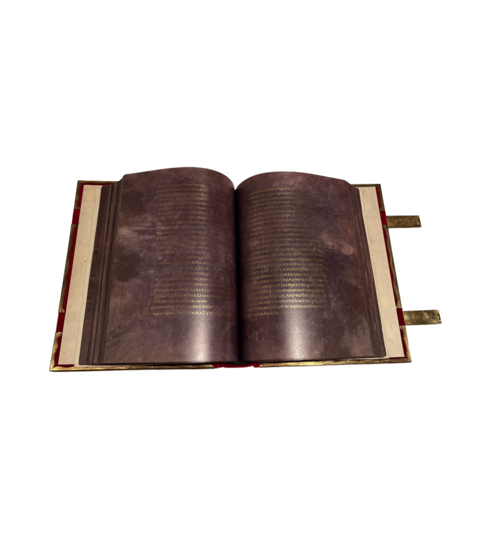 Das Krönungsevangeliar zählt zu den erlesensten Zeugnissen karolingischer Buchkunst und gehört zu den zentralen Reichskleinodien des mittelalterlichen Kaisertums. Um 800 in Aachen entstanden, vereint der Codex auf purpurgefärbtem Pergament die vier Evangelien, geschrieben in Gold und Silber und eingeleitet von vier antikisierend gestalteten Evangelistenbildern. Die 16 Kanontafeln, mit feinen Arkaden und mediterraner Klarheit gestaltet, spiegeln die Nähe zur Aachener Palastschule wider, deren Meister byzantinische Traditionen mit karolingischer Repräsentationskunst verbanden.