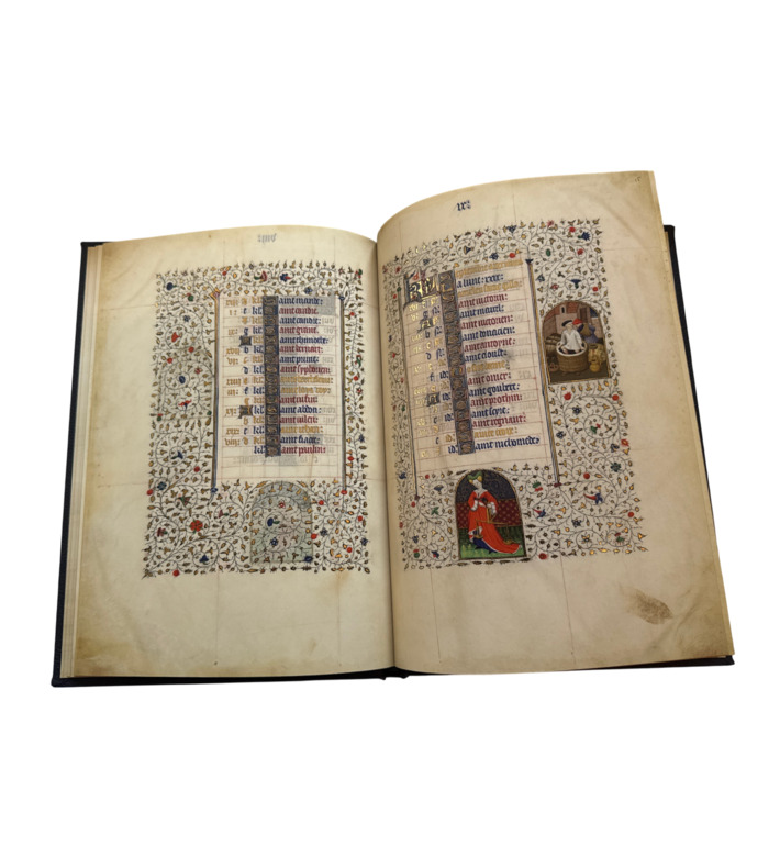 Das goldene Kalendarium ist ein prachtvolles Beispiel spätmittelalterlicher Buchkunst und verbindet astronomisches Wissen mit künstlerischer Strahlkraft. Entstanden im 15. Jahrhundert, präsentiert es die Monate des Jahres in aufwendig illuminierten Szenen, die bäuerliche Arbeiten, höfische Feste und die Zeichen des Tierkreises vereinen. Jede Seite ist reich mit Gold verziert und besticht durch detailreiche Miniaturen, die das Zusammenspiel von Natur, Kosmos und Glauben eindrucksvoll veranschaulichen.