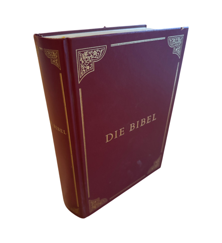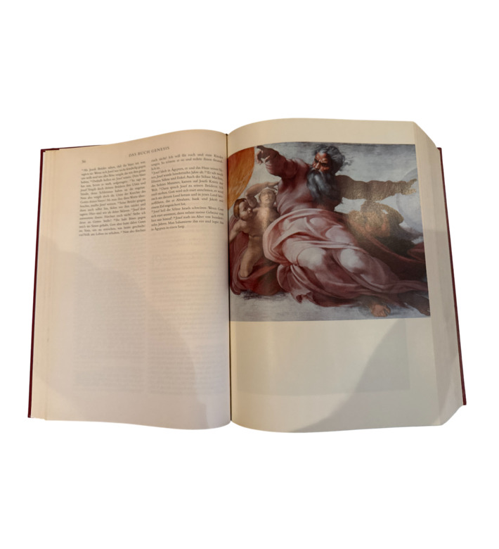 Diese Volksbibel vereint Altes und Neues Testament in der deutschen Einheitsübersetzung und präsentiert sich in einem roten Einband mit goldgeprägten Ornamenten, der an klassische Bibelausgaben des zwanzigsten Jahrhunderts erinnert. Der Band umfasst mehr als 1300 Seiten und zeichnet sich durch eine sorgfältig gesetzte Typografie aus, die den Text klar strukturiert und gut lesbar macht. Ganzseitige Farbtafeln mit Werken bedeutender Meister sowie ein umfangreiches Kartenmaterial vertiefen die biblischen Erzählräume und schaffen eine Verbindung zwischen Text, Kunst und historischer Geografie.