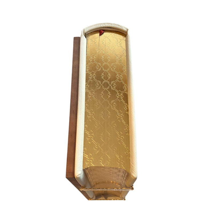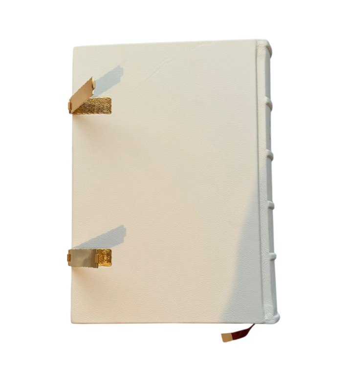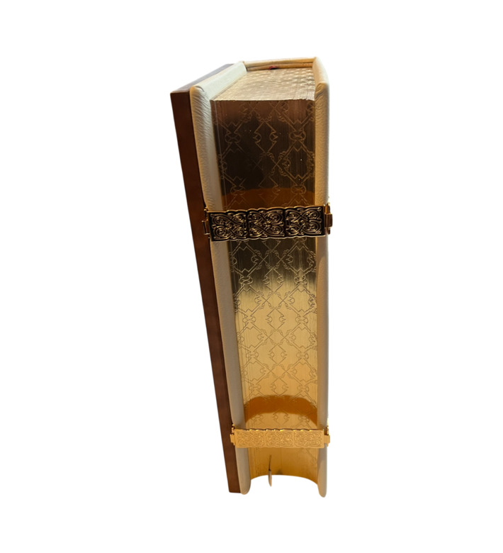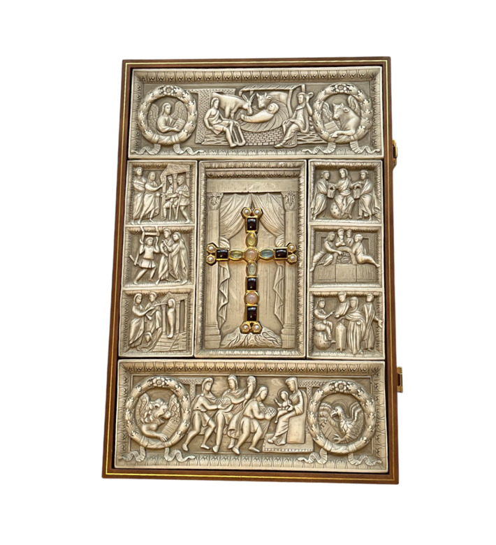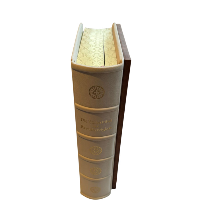Der prachtvolle Einband, inspiriert von einer Handschrift aus dem Mailänder Dom, verbindet vergoldetes Kreuz, Edelsteine und Perlen zu einem Meisterwerk moderner Handbuchbindekunst. Jede Bibel trägt eine handschriftliche Limitierungsnummer und wird in einer luxuriösen Kassette geschützt.