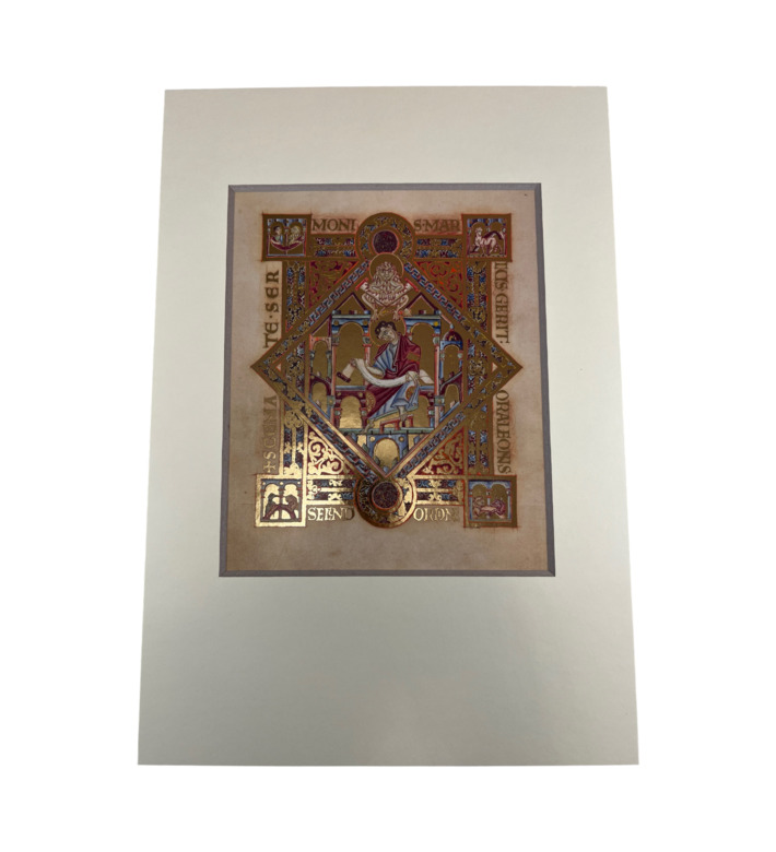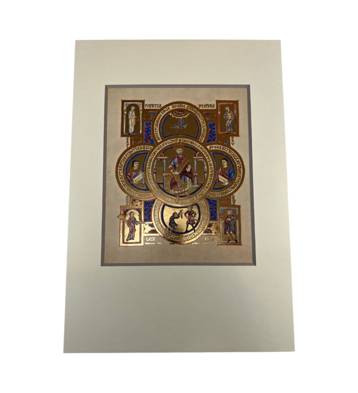Die Handschrift enthält die Evangelien nach Matthäus, Markus und Lukas sowie prächtige Widmungs- und Evangelistenbilder. Purpurgründe, goldene Schrift und feine Linienführung kennzeichnen die feierliche Bildsprache der Reichenauer Schule. In den Miniaturen erscheint Heinrich II. als von Gott legitimierter Herrscher – ein Bildprogramm, das die sakrale Dimension kaiserlicher Macht eindrucksvoll vermittelt.