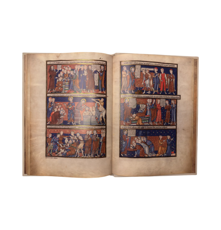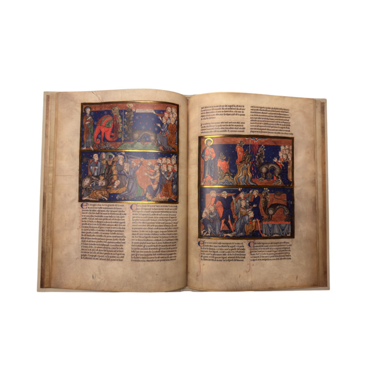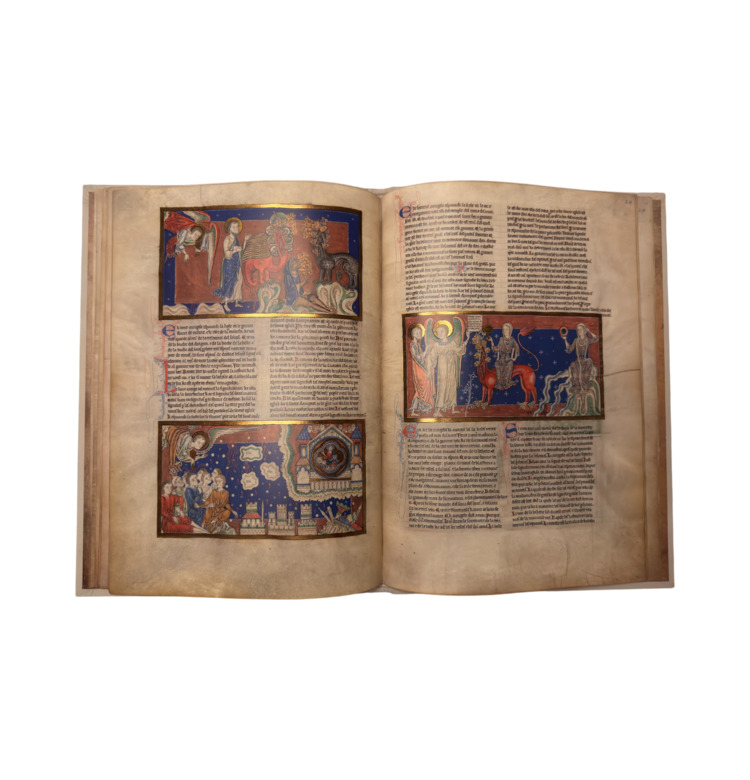 Vier Künstler, zwei noch im linearen englisch-romanischen Stil, zwei bereits im französisch-gotischen Stil arbeitend, schufen 71 Miniaturen mit über 100 Einzelbildern, reich verziert mit Gold, kräftigem Rot und tiefem Blau. Die Visionen der Offenbarung des Johannes – Katastrophen, Engel, apokalyptische Bestien – erscheinen in einer Bildsprache von überwältigender Eindringlichkeit.