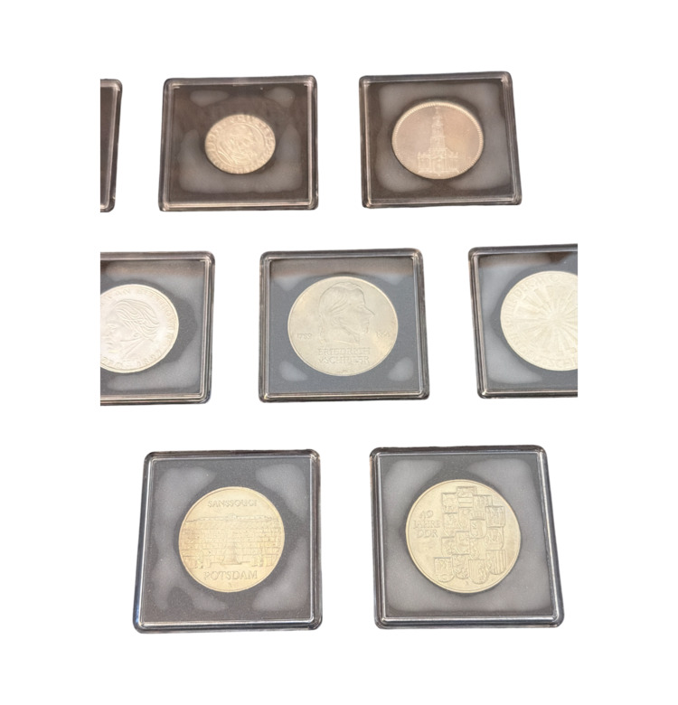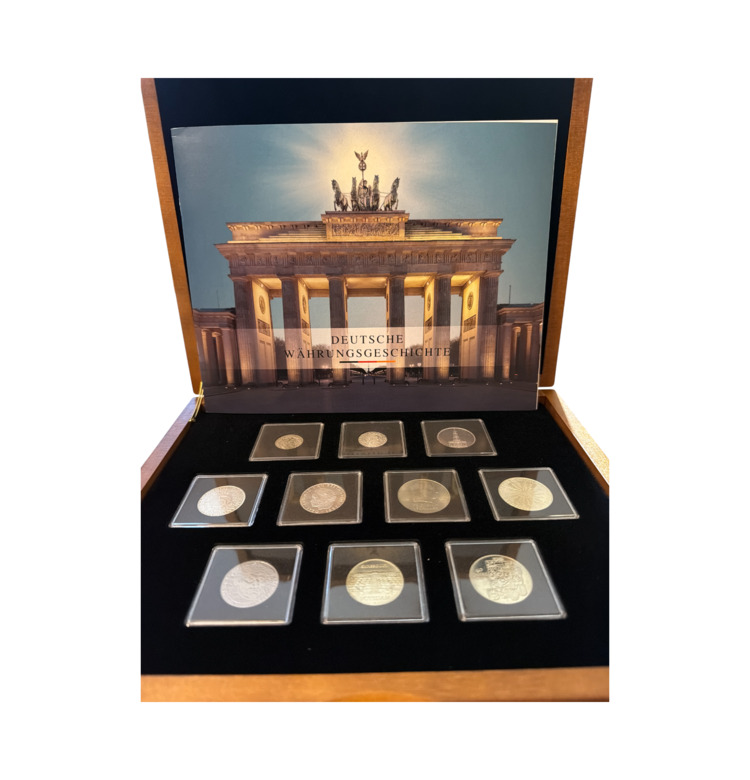 Deutsche Währungsgeschichte dokumentiert die Entwicklung des deutschen Geldwesens vom Deutschen Kaiserreich bis zur Wiedervereinigung. Das Programm umfasst 21 thematisch aufgebaute Folder, die jeweils eine abgeschlossene historische Epoche behandeln und Münzsätze sowie Briefmarken als zeittypische Zeugnisse vereinen.