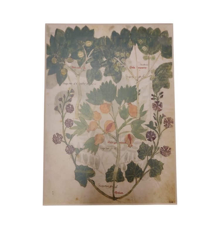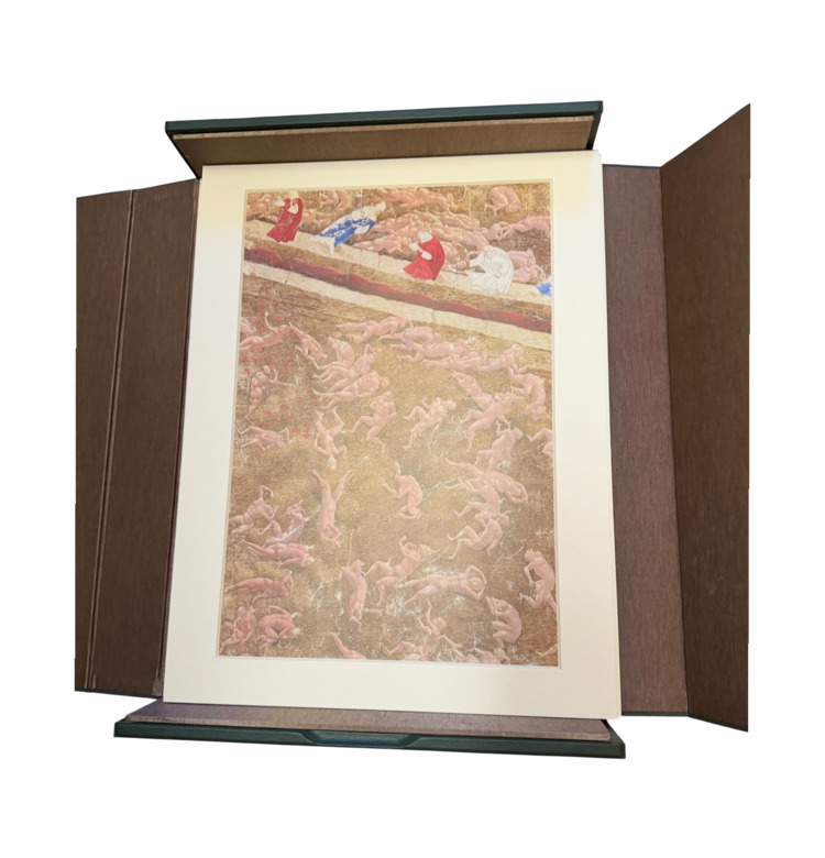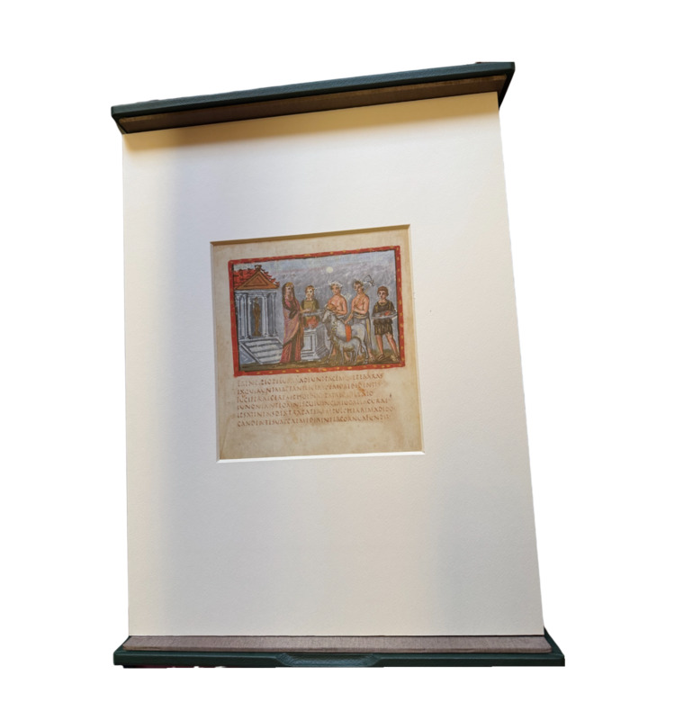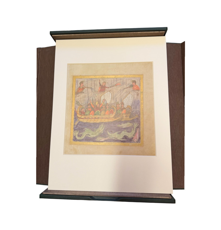 Jedes Blatt ist in einem hochwertigen Passepartout präsentiert. Die Kassette selbst trägt als Zierstück eine echtvergoldete Messingscheibe nach dem Vorbild einer astrologischen Tafel aus dem Ptolemäus-Handtafel-Codex.