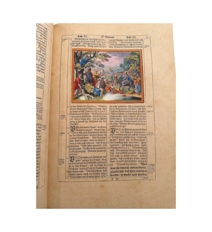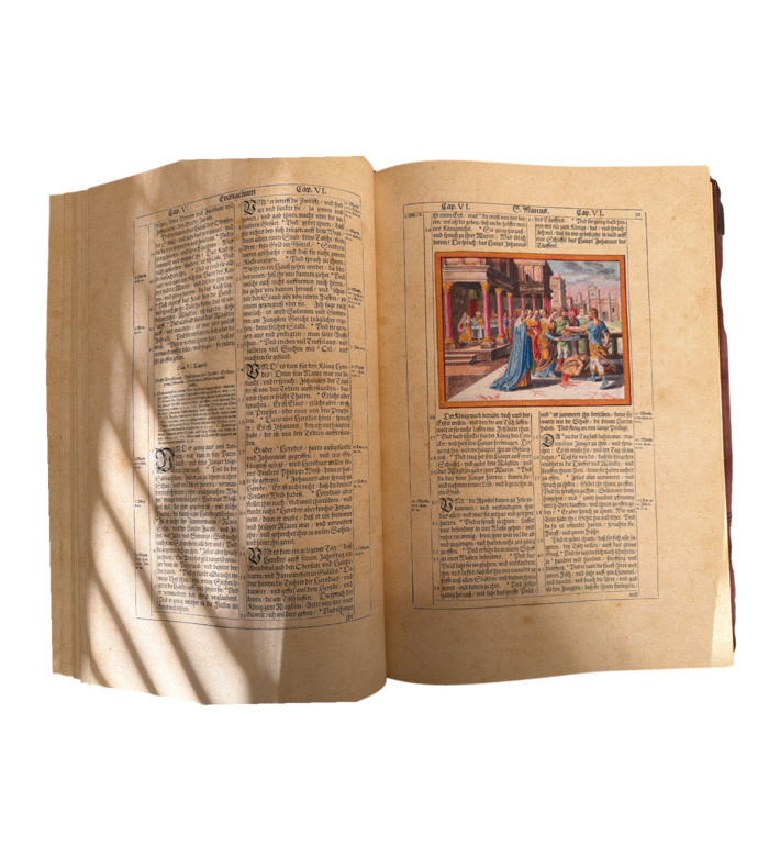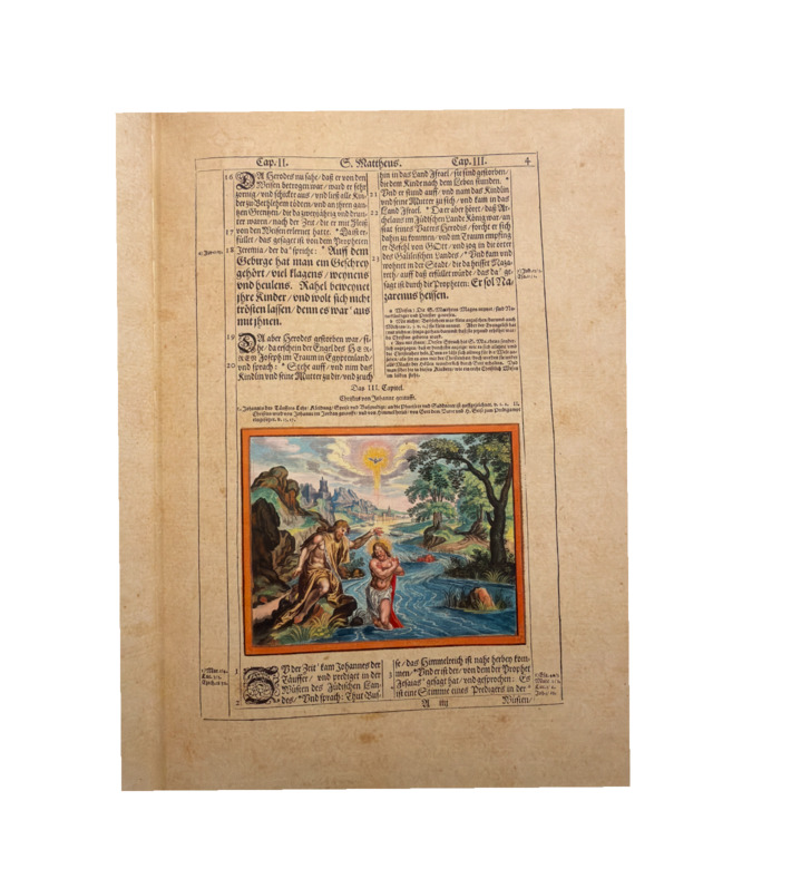 Die berühmte „Kupferbibel“ des Matthäus Merian d. Ä. (1593–1650) zählt zu den prachtvollsten Druckwerken des 17. Jahrhunderts. 1630 veröffentlicht, vereint sie den Text des Neuen Testaments in deutscher Sprache, gesetzt in eleganter Frakturschrift, mit 77 meisterhaften Kupferstichen. Diese kolorierten Illustrationen gelten als Höhepunkt barocker Druckgrafik und verbinden außerordentliche Detailgenauigkeit mit künstlerischer Lebendigkeit.
