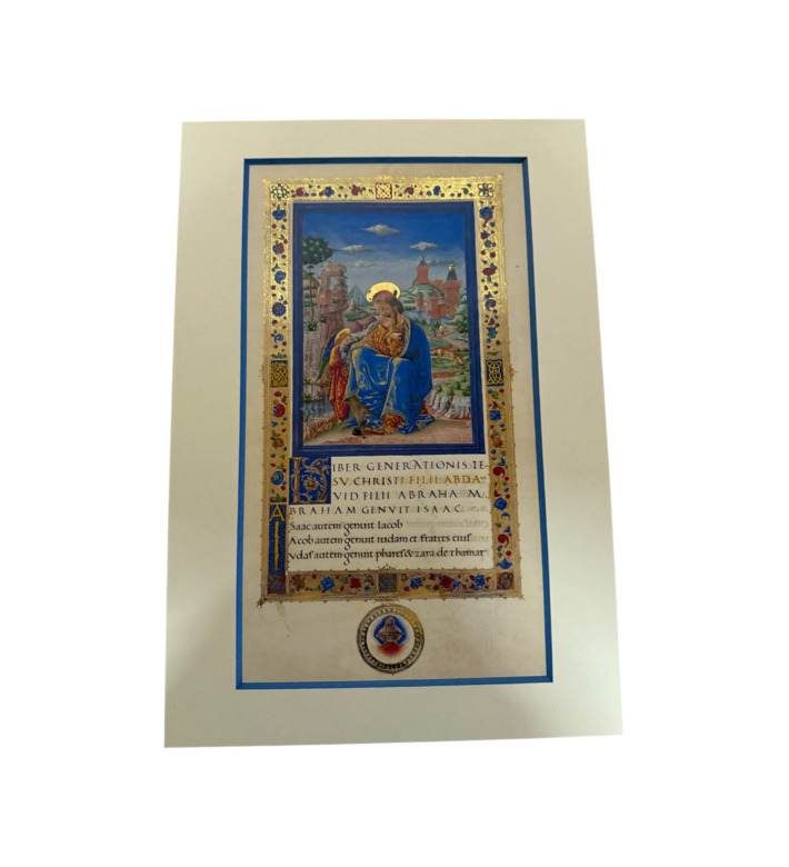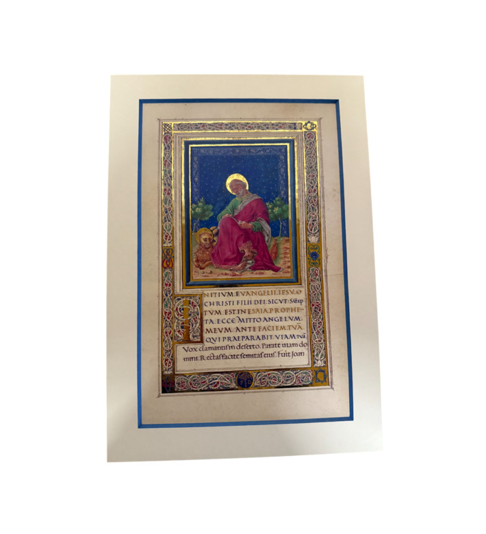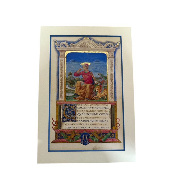 Die Miniaturen zeigen Matthäus, Markus, Lukas und Johannes in leuchtenden Farben, vor goldenen Ornamentrahmen und weiten Landschaften. Mit natürlicher Körperhaltung, fein modellierten Gewändern und subtilem Lichteinsatz verkörpern sie den Übergang von der mittelalterlichen Buchmalerei zur Kunst der italienischen Frührenaissance.