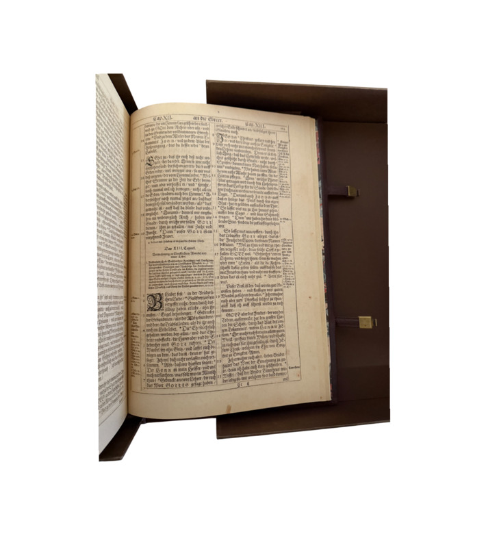 Das prachtvolle Werk erschien bei den Erben des Straßburger Druckers Lazarus Zetzner. Mit Goldschnitt, Lederband, Metallschließen und reicher Prägung ausgestattet, gehört die „Kupferbibel“ zu den begehrtesten Bibelausgaben der Frühen Neuzeit und ist ein Meilenstein barocker Buchkunst.