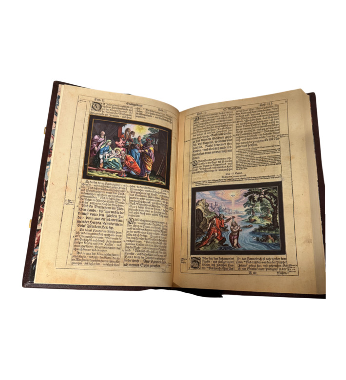 Die berühmte „Kupferbibel“ des Matthäus Merian d. Ä. (1593–1650) zählt zu den prachtvollsten Druckwerken des 17. Jahrhunderts. 1630 veröffentlicht, vereint sie den Text des Neuen Testaments in deutscher Sprache, gesetzt in eleganter Frakturschrift, mit 77 meisterhaften Kupferstichen. Diese kolorierten Illustrationen gelten als Höhepunkt barocker Druckgrafik und verbinden außerordentliche Detailgenauigkeit mit künstlerischer Lebendigkeit.