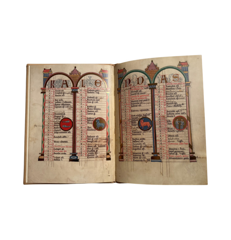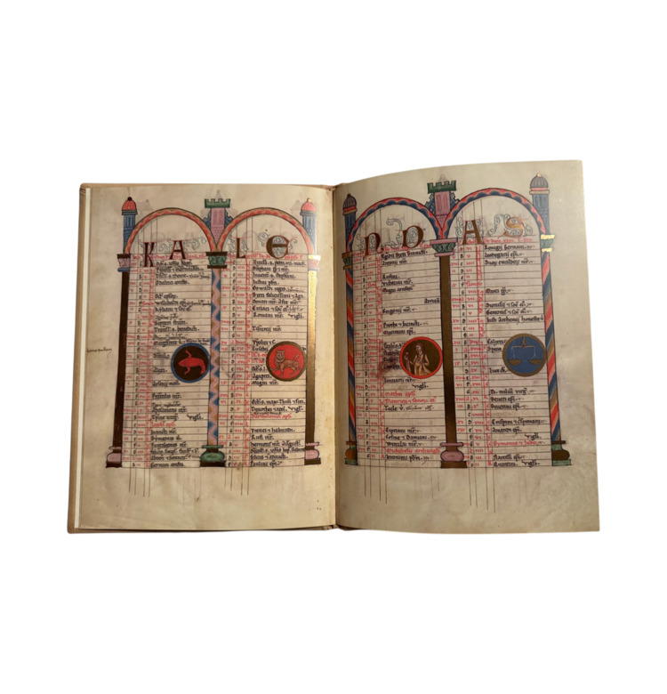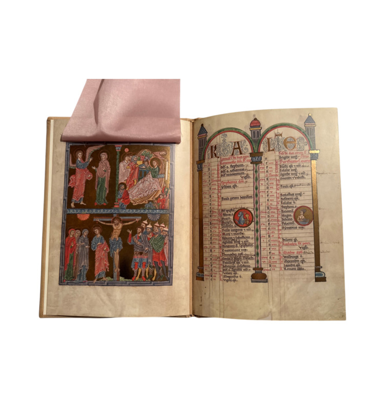 Der vollständige Kalender ist in reich ornamentierte Arkadenrahmen gefasst und mit Tierkreiszeichen in Medaillons versehen. Zwei ganzseitige Bildseiten zeigen Szenen aus dem Leben Christi in leuchtenden Farben auf strahlendem Goldgrund. Charakteristisch ist der sogenannte Zackenstil, der mit seinen scharf geführten Gewandfalten und klaren Konturen eine Brücke zwischen Romanik und Gotik schlägt.