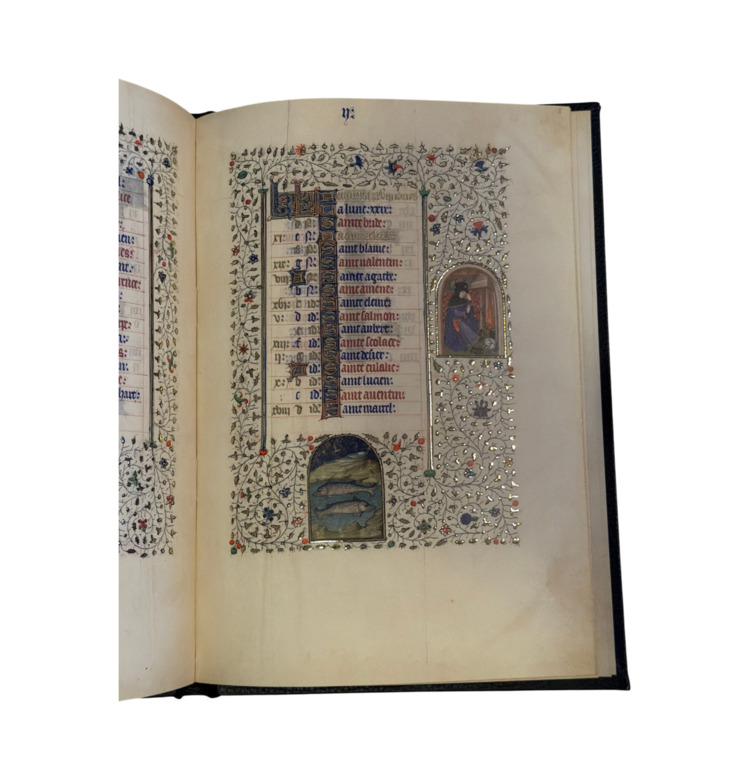Das goldene Kalendarium ist ein prachtvolles Beispiel spätmittelalterlicher Buchkunst und verbindet astronomisches Wissen mit künstlerischer Strahlkraft. Entstanden im 15. Jahrhundert, präsentiert es die Monate des Jahres in aufwendig illuminierten Szenen, die bäuerliche Arbeiten, höfische Feste und die Zeichen des Tierkreises vereinen. Jede Seite ist reich mit Gold verziert und besticht durch detailreiche Miniaturen, die das Zusammenspiel von Natur, Kosmos und Glauben eindrucksvoll veranschaulichen.