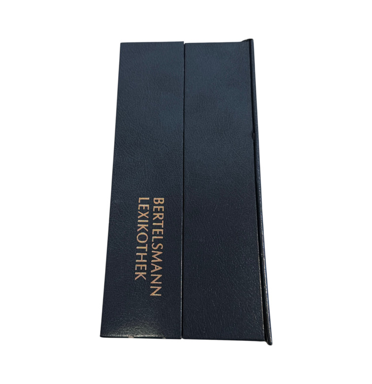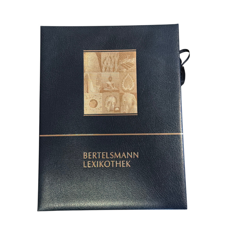 Dieses Objekt der Bertelsmann Lexikothek verbindet die klassische Form des gebundenen Bandes mit einem frühen digitalen Wissensmedium. In einer aufwendig gestalteten Kassette vereint das Set einen dunkelblauen, goldgeprägten Begleitband mit einer CD-ROM des sogenannten Lexikodisc-Systems.