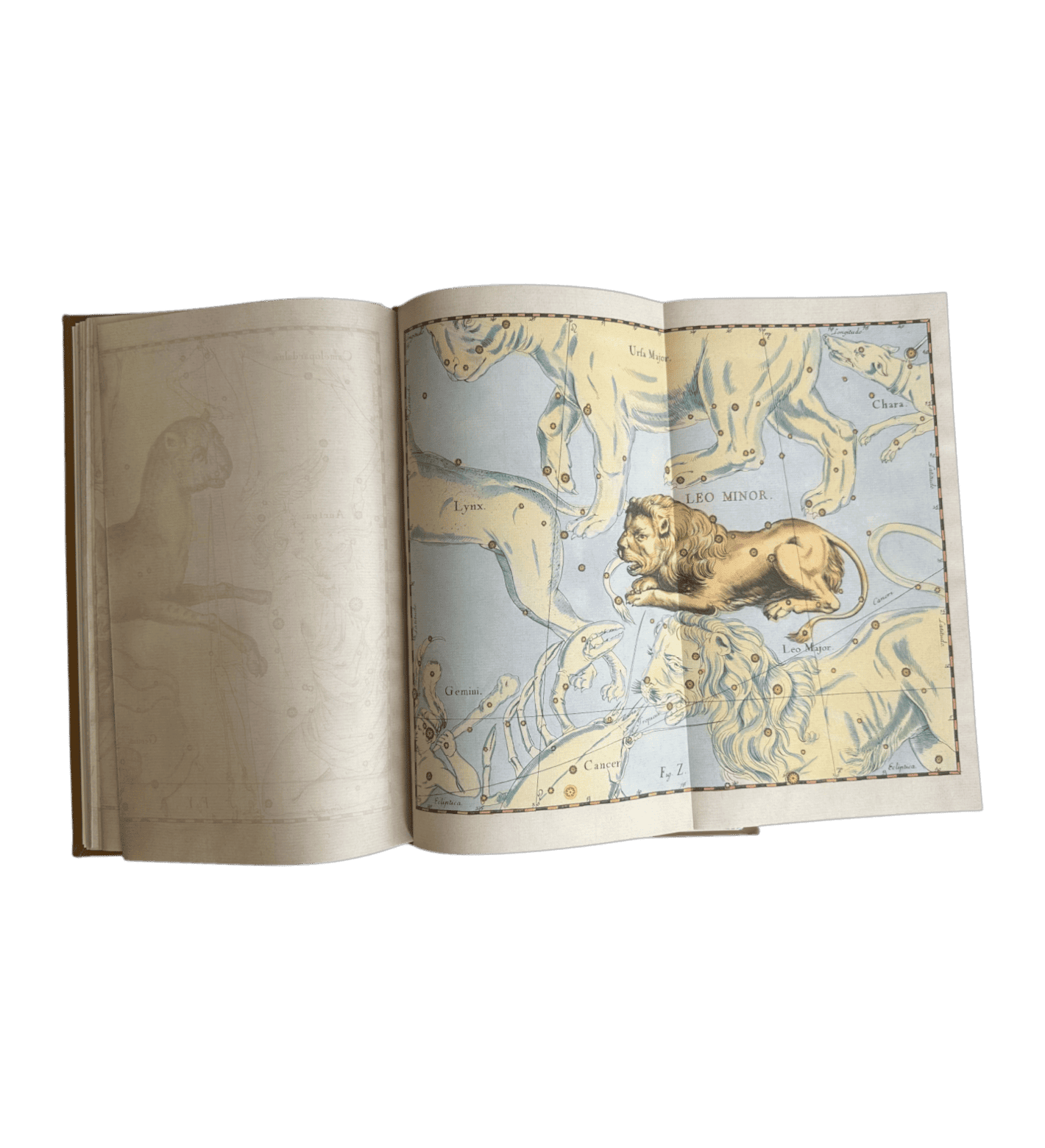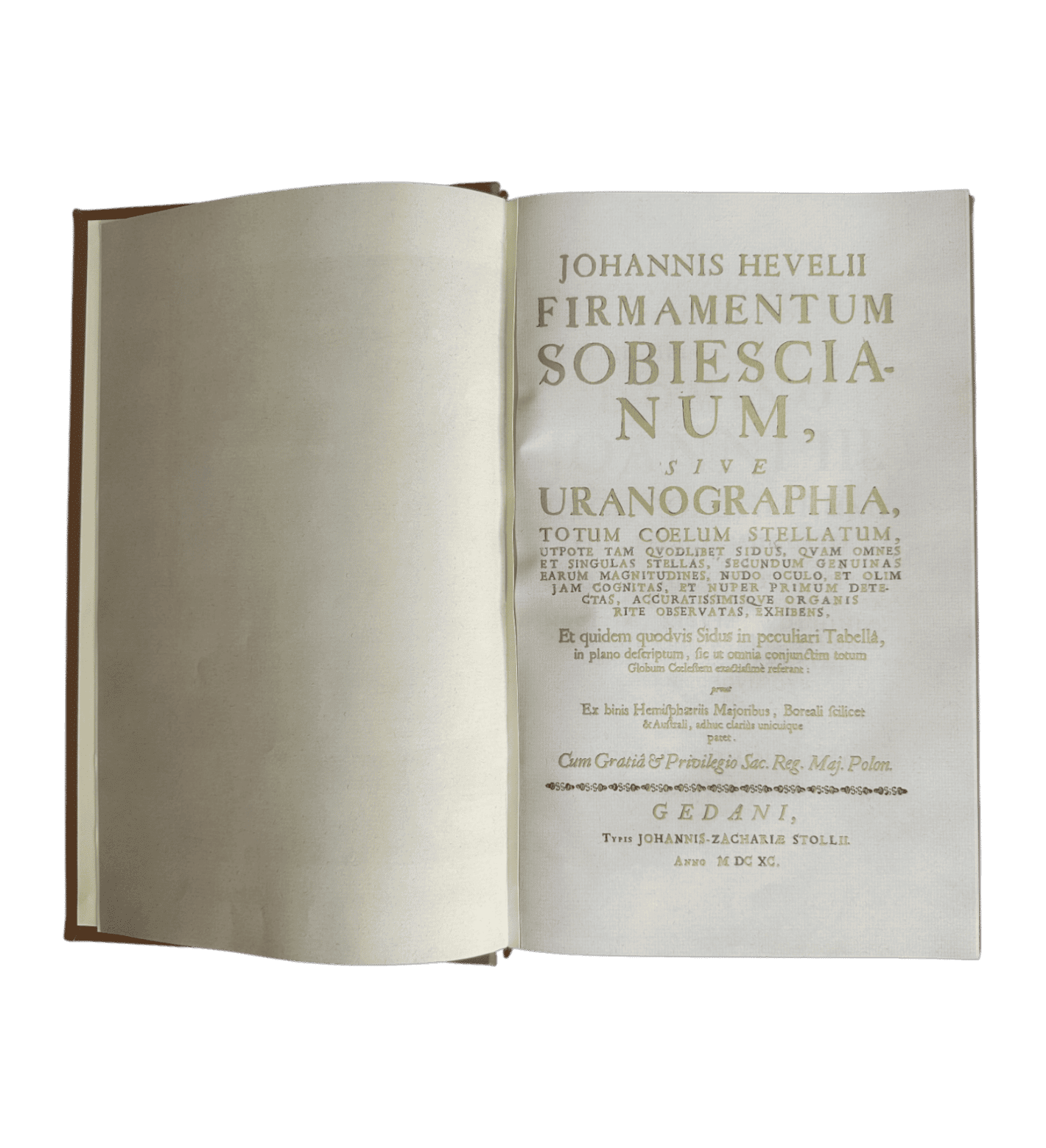Sein prachtvoller Sternenatlas Firmamentum Sobiescianum sive Uranographia erschien posthum 1690 und markiert einen Höhepunkt der Astronomiegeschichte. Auf 56 detailreichen Sternkarten führte Hevelius sieben neue Sternbilder ein, von denen einige in abgewandelter Form bis heute gültig sind. Das Werk gehört zu den bedeutendsten Himmelsatlanten der Neuzeit und zeugt von Hevelius’ einzigartigem Beitrag zur Erschließung des Firmaments.