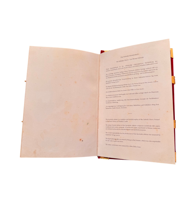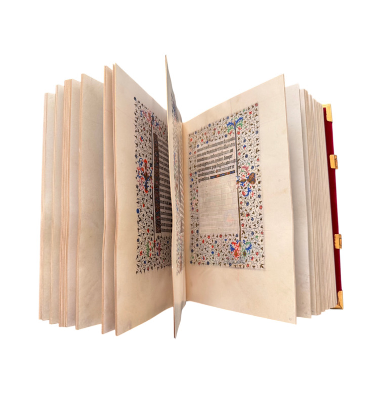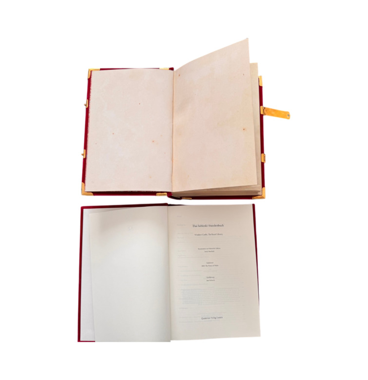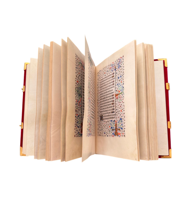 Das Sobieski-Stundenbuch wurde um 1420 von Margarete von Burgund in Auftrag gegeben, vermutlich anlässlich ihrer Hochzeit mit Arthur III., Herzog der Bretagne. Mit 468 Pergamentseiten, 60 ganzseitigen Miniaturen, über 400 Einzelszenen und unzähligen Prachtinitialen zählt es zu den bedeutendsten Handschriften der französischen Spätgotik. An der Ausstattung wirkten mehrere der großen Pariser Meister: der Bedford-Meister, der Fastolf-Meister und der Meister der Münchner Legenda Aurea. Ihre Darstellungen verbinden erzählerische Fülle mit künstlerischer Harmonie. Die Miniaturen entfalten biblische Szenen wie eine Bildergeschichte, reich an Landschaftspanoramen und architektonischen Fantasien. Damit ist das Stundenbuch nicht nur ein Dokument höfischer Kultur des 15. Jahrhunderts, sondern zugleich ein herausragendes Zeugnis gemeinschaftlicher Buchkunst, das die Virtuosität gleich mehrerer führender Werkstätten seiner Zeit bündelt.