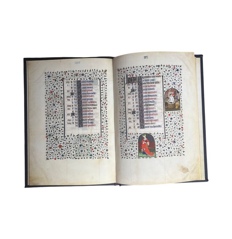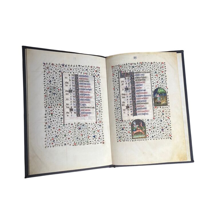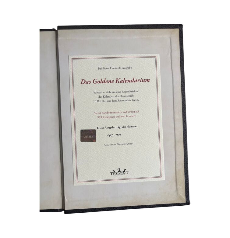 Das goldene Kalendarium ist ein prachtvolles Beispiel spätmittelalterlicher Buchkunst und verbindet astronomisches Wissen mit künstlerischer Strahlkraft. Entstanden im 15. Jahrhundert, präsentiert es die Monate des Jahres in aufwendig illuminierten Szenen, die bäuerliche Arbeiten, höfische Feste und die Zeichen des Tierkreises vereinen. Jede Seite ist reich mit Gold verziert und besticht durch detailreiche Miniaturen, die das Zusammenspiel von Natur, Kosmos und Glauben eindrucksvoll veranschaulichen.