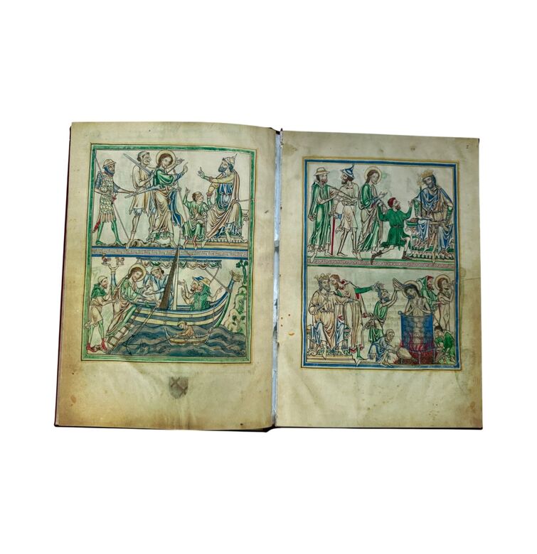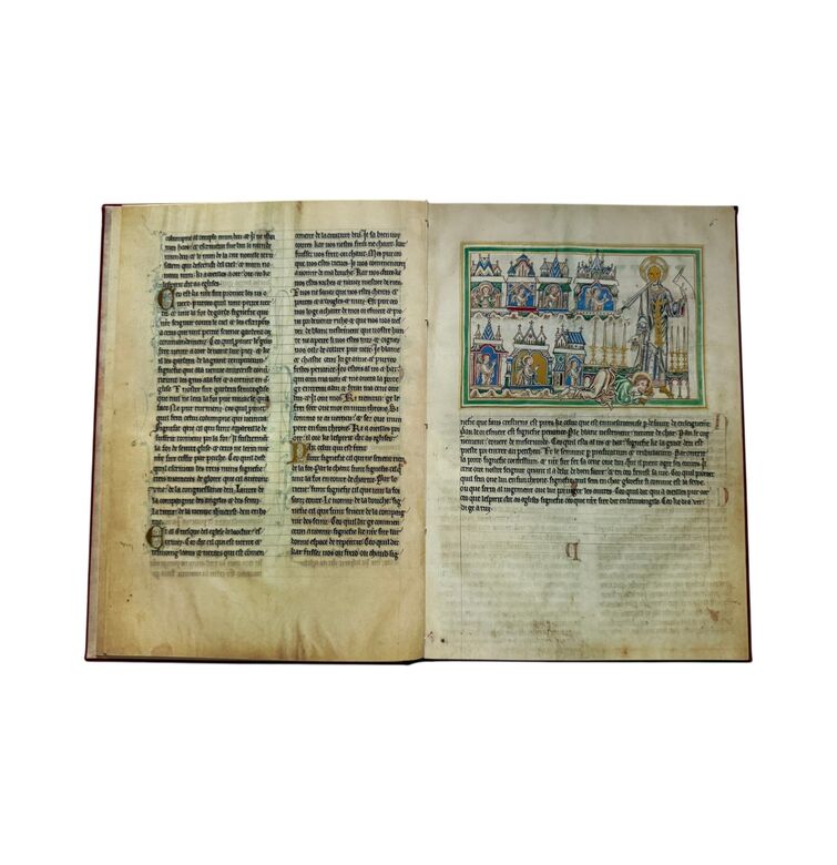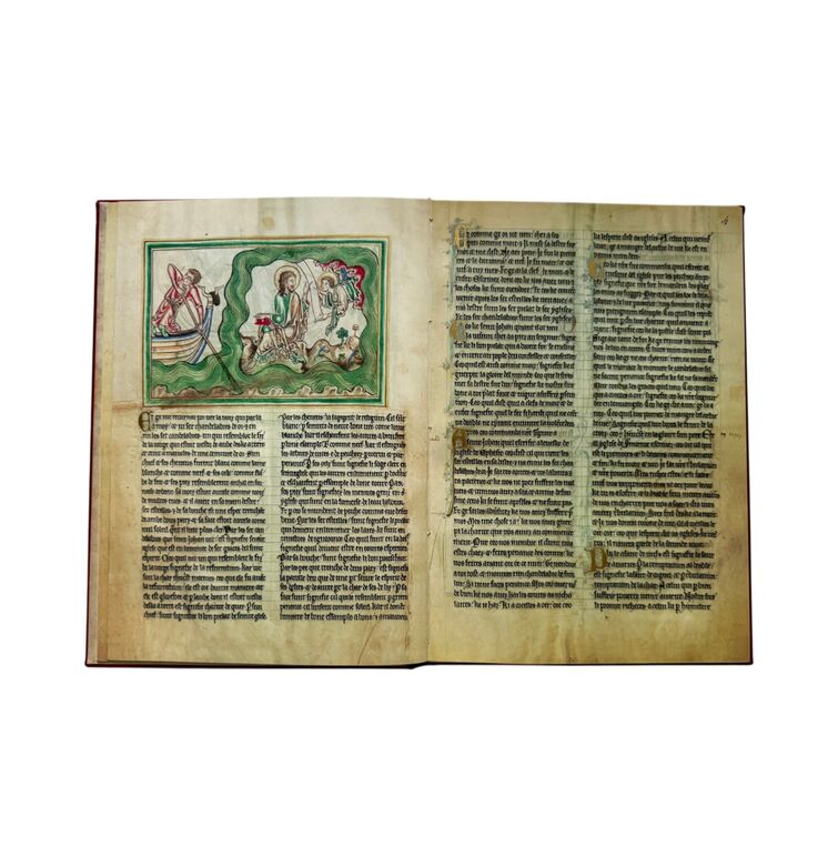 Auf 100 reich verzierten Seiten entfaltet sich ein Zyklus von Miniaturen, die den Text der Offenbarung des Johannes in leuchtenden Farben und mit großzügigem Goldschmuck illustrieren. Jede Szene ist in fein komponierten Registern angelegt, gerahmt von grün-goldenen Ornamentbändern. Die anmutigen, gotisch verfeinerten Figuren kontrastieren mit den dramatischen Visionen der Apokalypse – ein faszinierendes Spannungsverhältnis von Schönheit und Schrecken.