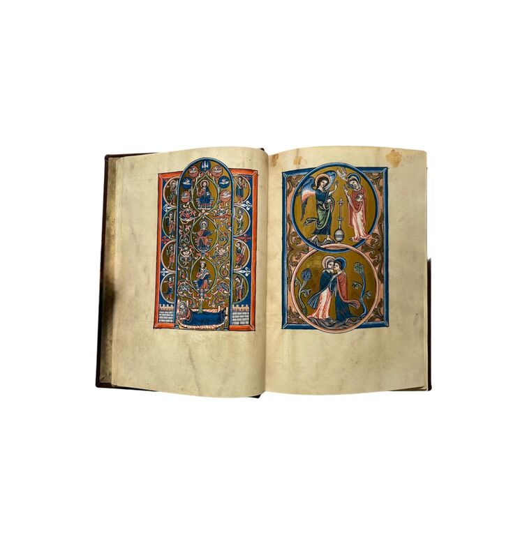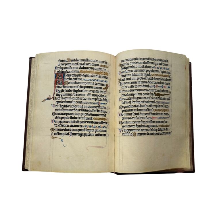 Die Handschrift umfasst 384 Seiten auf Pergament mit 27 ganzseitigen Miniaturen, 24 Kalendermedaillons und neun vergoldeten Initialen. Jede Seite ist in leuchtende Farben und schimmerndes Blattgold getaucht. Die Darstellungen erinnern in ihrer Strahlkraft und Komposition an die Glasfenster der französischen Kathedralen, während ornamentale Drôlerien und Tierfiguren die Ränder beleben.
