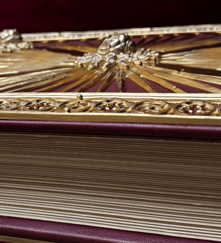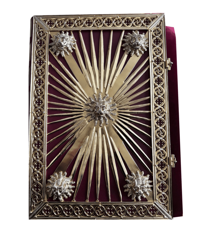 Ein einzigartiges Merkmal sind die beiden erhaltenen Buchdeckel aus vergoldetem Silber, verziert mit filigranen Sonnenstrahlen und fünf plastischen Löwenköpfen. Dieses Evangeliar vereint höchste Schreibkunst, Miniaturmalerei und Goldschmiedekunst und zählt zu den bedeutendsten Prunkhandschriften des 14. Jahrhunderts.