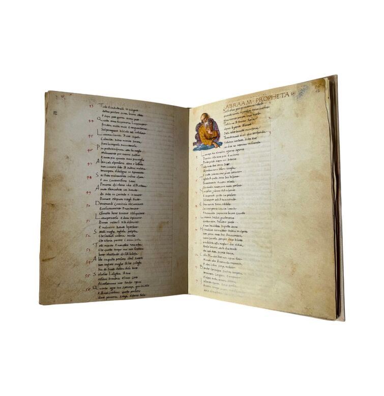 Der prächtig illuminierte Codex zeigt das Rad der Fortuna, Propheten, Tierkreiszeichen und Himmelssphären, ausgeführt in leuchtenden Farben und reichem Gold. Die Miniaturen verbinden dramatische Szenen mit feinem Humor und spiegeln den Einfluss der großen Malerei des Quattrocento wider.