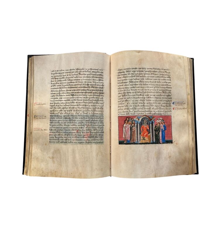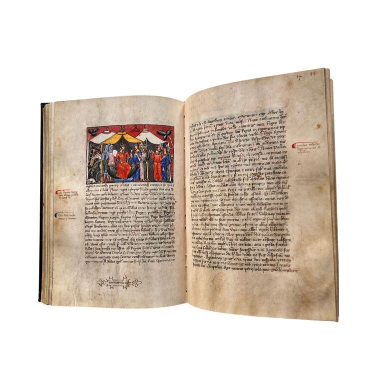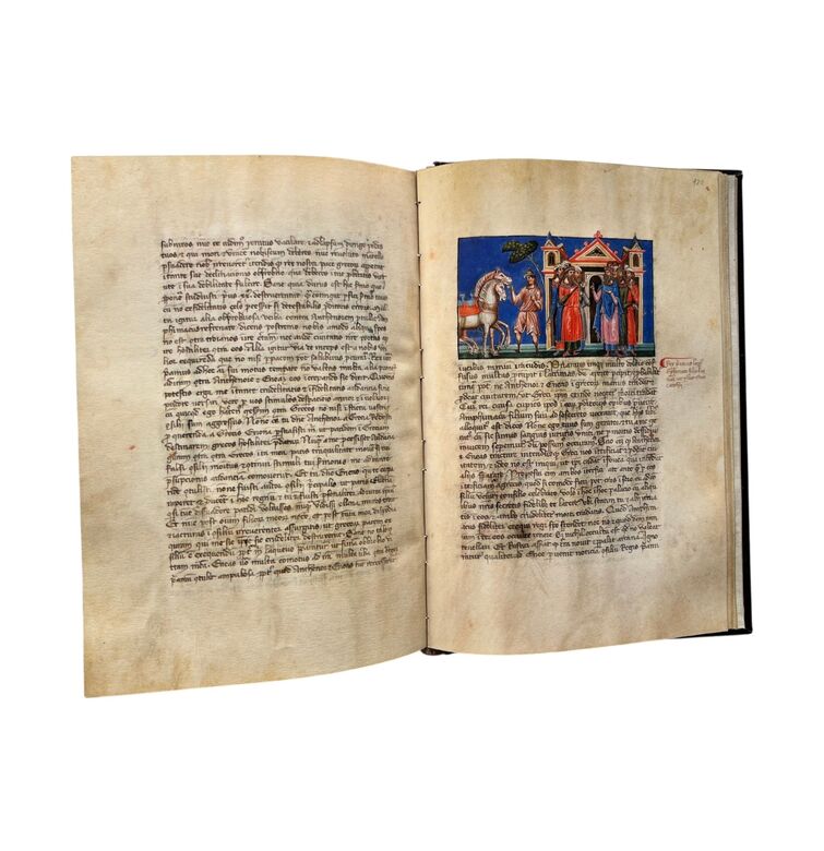 Die unter dem Siglum MS 17805 in Madrid verwahrte Handschrift gehört zu den eindrucksvollsten illuminierten Fassungen des Trojanischen Kriegs. Die lateinische Prosa geht auf Guido delle Colonne zurück, einen Gelehrten des 13. Jahrhunderts aus dem Umfeld Kaiser Friedrichs II. Die venezianische Abschrift aus der Zeit um 1340–1350 vereint sorgfältig ausgeführten Text mit einer prachtvollen Ausstattung aus historisierten Goldinitialen und farbintensiven Miniaturen.