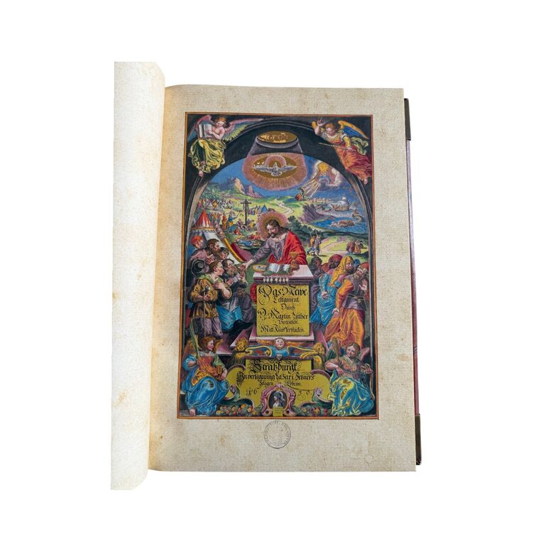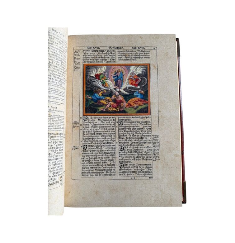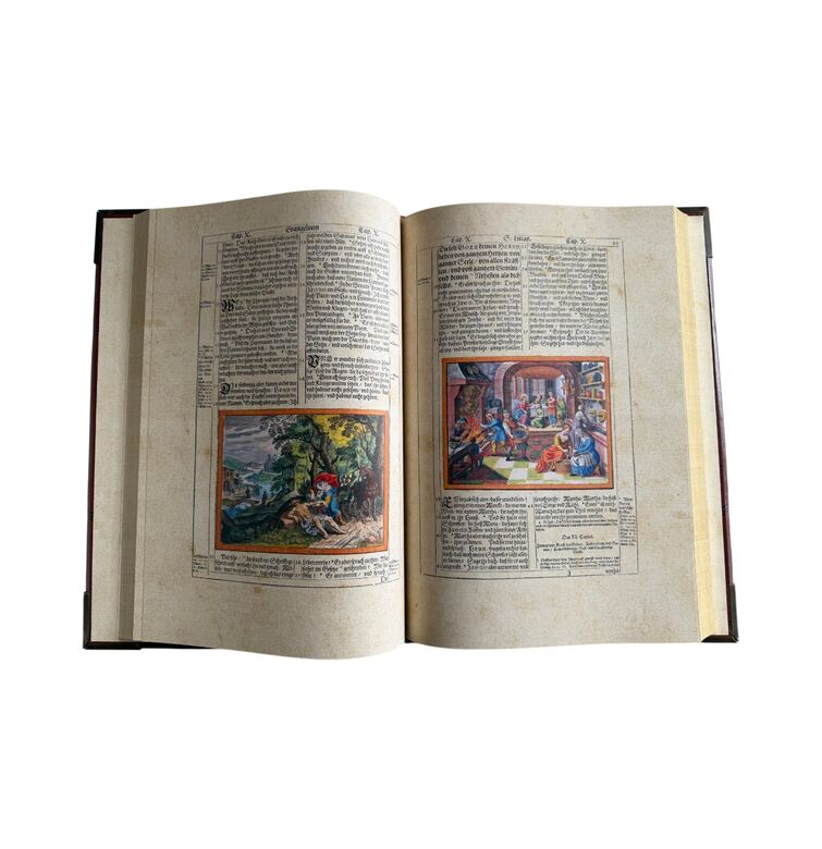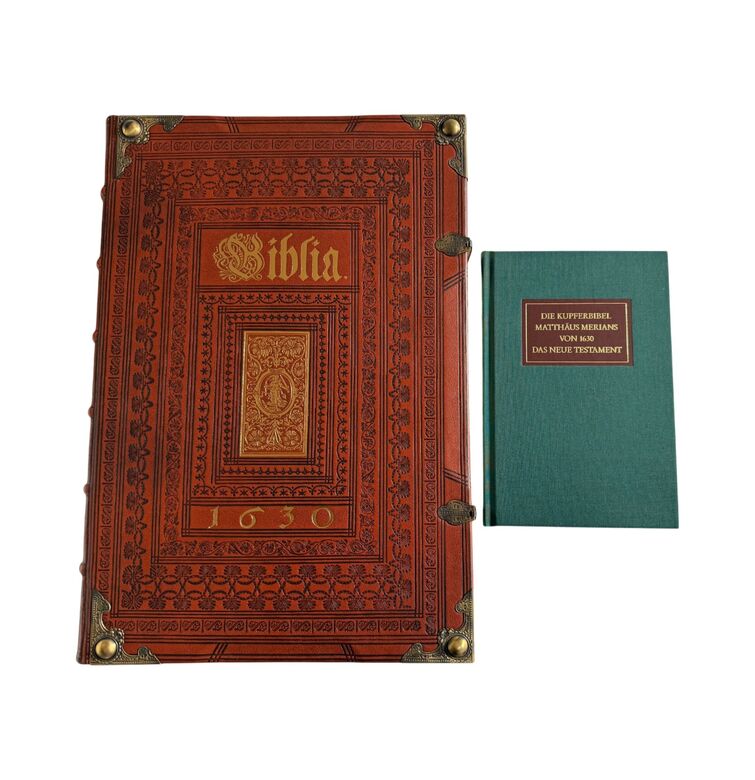 Die berühmte „Kupferbibel“ des Matthäus Merian d. Ä. (1593–1650) zählt zu den prachtvollsten Druckwerken des 17. Jahrhunderts. 1630 veröffentlicht, vereint sie den Text des Neuen Testaments in deutscher Sprache, gesetzt in eleganter Frakturschrift, mit 77 meisterhaften Kupferstichen. Diese kolorierten Illustrationen gelten als Höhepunkt barocker Druckgrafik und verbinden außerordentliche Detailgenauigkeit mit künstlerischer Lebendigkeit.