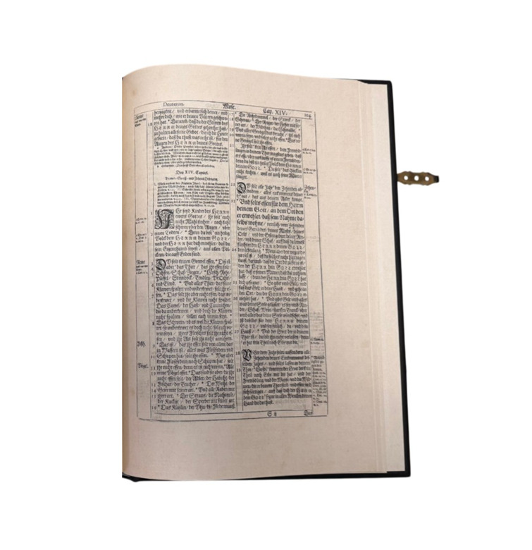 Als Schüler der Zürcher und französischen Stecherschulen und späterer Frankfurter Verleger prägte Merian eine ganze Dynastie von Künstlern und Druckern. Die prachtvoll ausgestattete Kupferbibel, mit Goldschnitt, geprägtem Ledereinband und Metallschließen, gilt als ein Höhepunkt der religiösen Buchillustration des 17. Jahrhunderts und als eines der schönsten Zeugnisse frühneuzeitlicher Druckkunst.