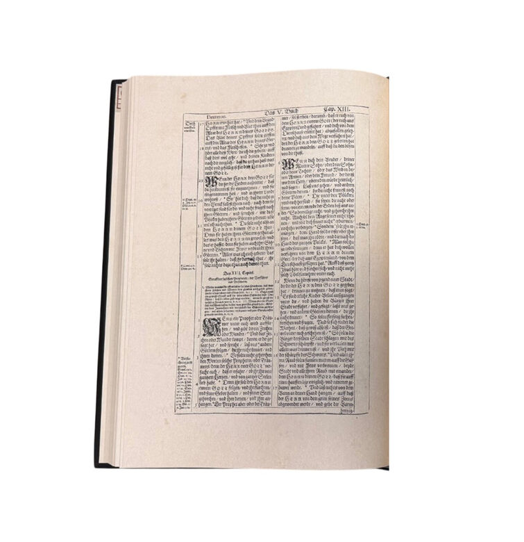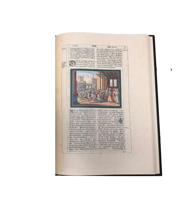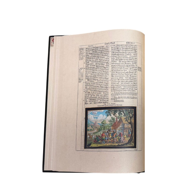Die sogenannte Kupferbibel des Matthäus Merian d. Ä. (1593–1650) zählt zu den herausragendsten Bibelausgaben der Barockzeit. Der 1630 in Straßburg erschienene Band des Alten Testaments verbindet den in eleganter Frakturschrift gedruckten deutschen Text mit einer außergewöhnlichen Folge von 157 meisterhaft kolorierten Kupferstichen. Diese Darstellungen biblischer Szenen zeigen Merians unvergleichliche Kunstfertigkeit, die Feinheit seiner Linienführung und seine Fähigkeit, Bewegung, Licht und Raum in Kupfer zu bannen.
