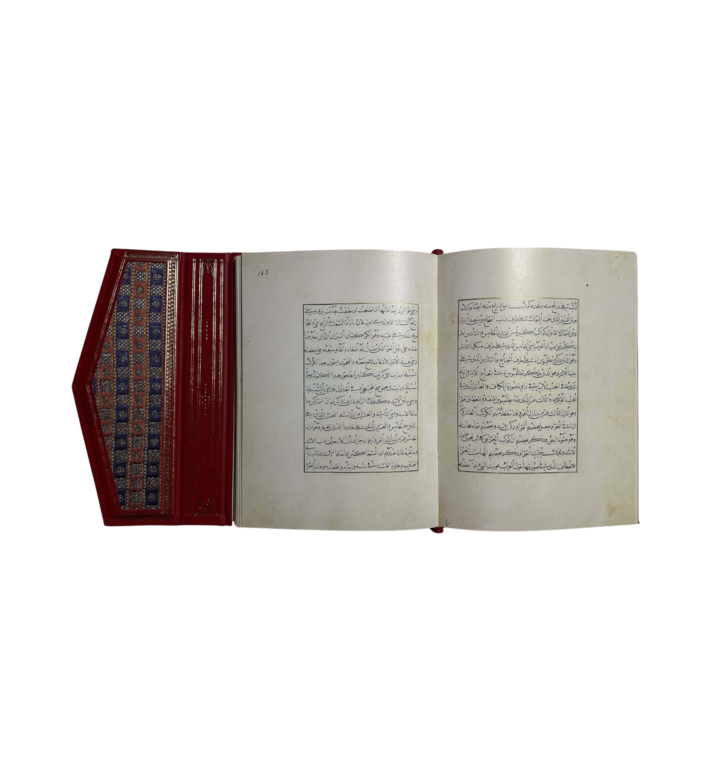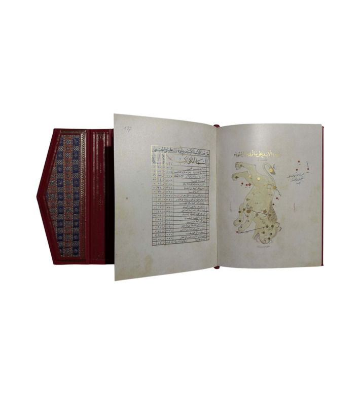 Die Handschrift verbindet wissenschaftliche Präzision mit höchster künstlerischer Raffinesse: 74 Miniaturen zeigen die Sternbilder in zweifacher Ansicht – so, wie sie am Himmel erscheinen, und spiegelbildlich als Projektion auf eine Sphäre. In filigranen Pastellfarben gehalten, mit Gold für die Sterne und Rot für die Begleitsterne, bilden sie einen Höhepunkt islamischer Buchkunst mit Einflüssen aus der chinesischen Malerei.