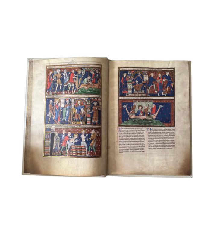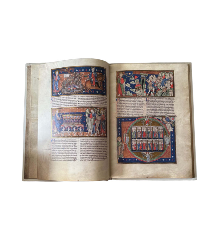 Vier Künstler, zwei noch im linearen englisch-romanischen Stil, zwei bereits im französisch-gotischen Stil arbeitend, schufen 71 Miniaturen mit über 100 Einzelbildern, reich verziert mit Gold, kräftigem Rot und tiefem Blau. Die Visionen der Offenbarung des Johannes – Katastrophen, Engel, apokalyptische Bestien – erscheinen in einer Bildsprache von überwältigender Eindringlichkeit.