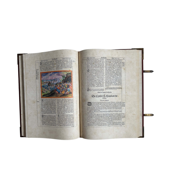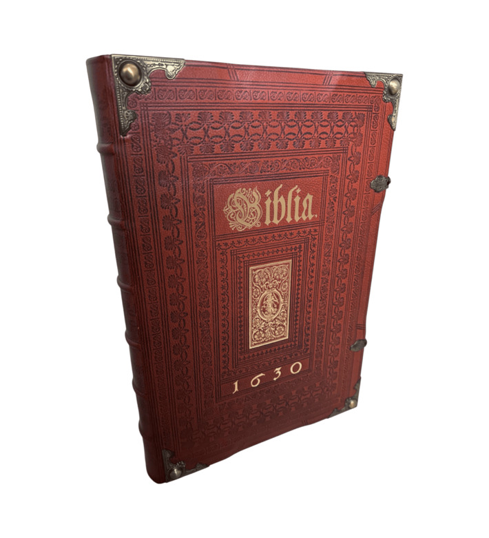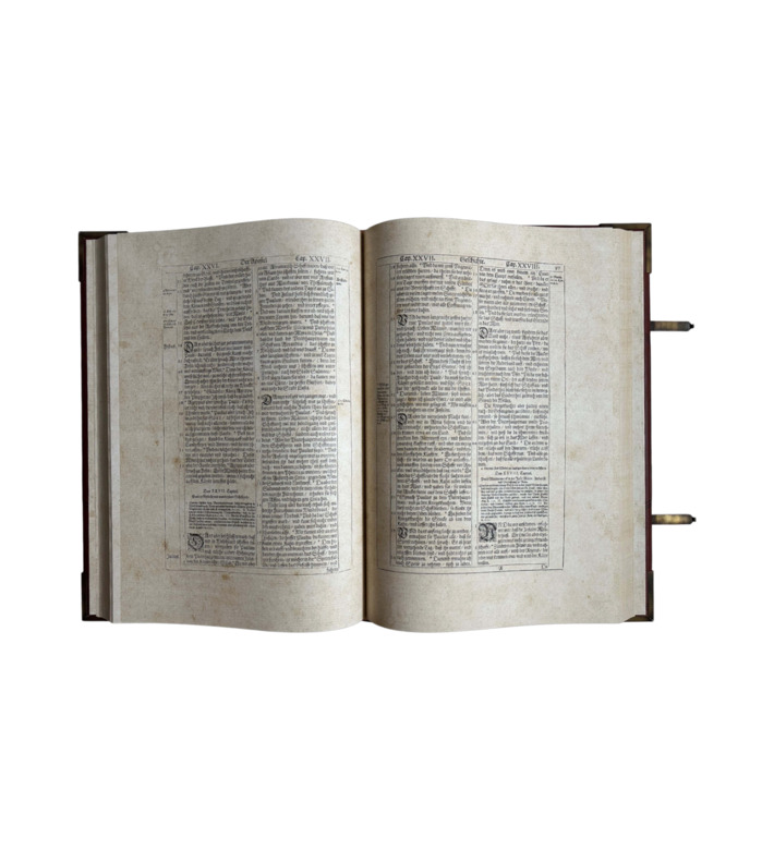 Das prachtvolle Werk erschien bei den Erben des Straßburger Druckers Lazarus Zetzner. Mit Goldschnitt, Lederband, Metallschließen und reicher Prägung ausgestattet, gehört die „Kupferbibel“ zu den begehrtesten Bibelausgaben der Frühen Neuzeit und ist ein Meilenstein barocker Buchkunst.