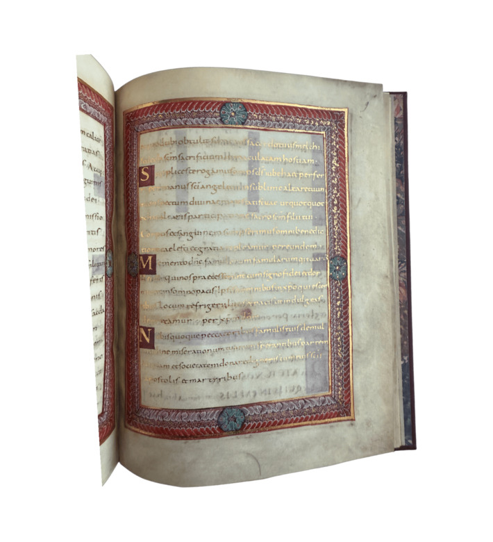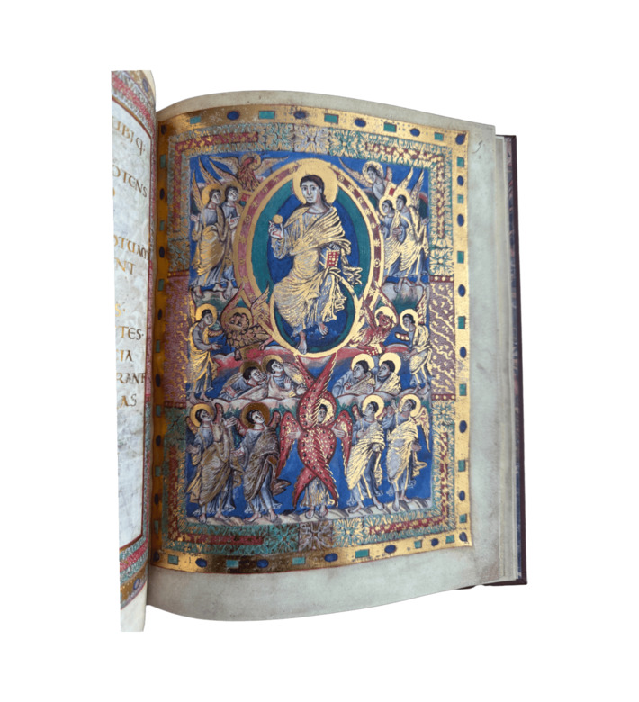 Von dem ursprünglich geplanten Sakramentar ist nur ein Fragment von zehn Blättern erhalten, das jedoch den zentralen liturgischen Teil – den Canon Missae – umfasst. Die Handschrift beeindruckt durch ihre prachtvolle Ausstattung mit sieben ganzseitigen Miniaturen, reichem Ornamentdekor und einem in Goldschrift ausgeführten Text. Besonders berühmt ist die Darstellung der Hand Gottes, die Karl den Kahlen krönt – eine einzigartige Ikonographie in der karolingischen Kunst.