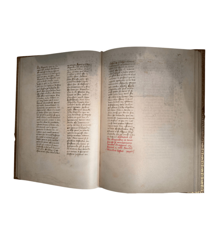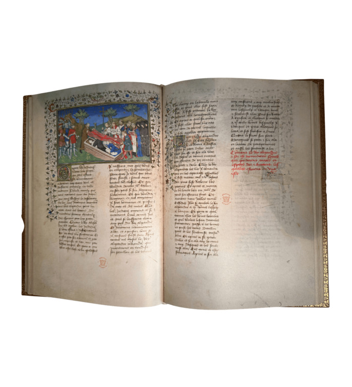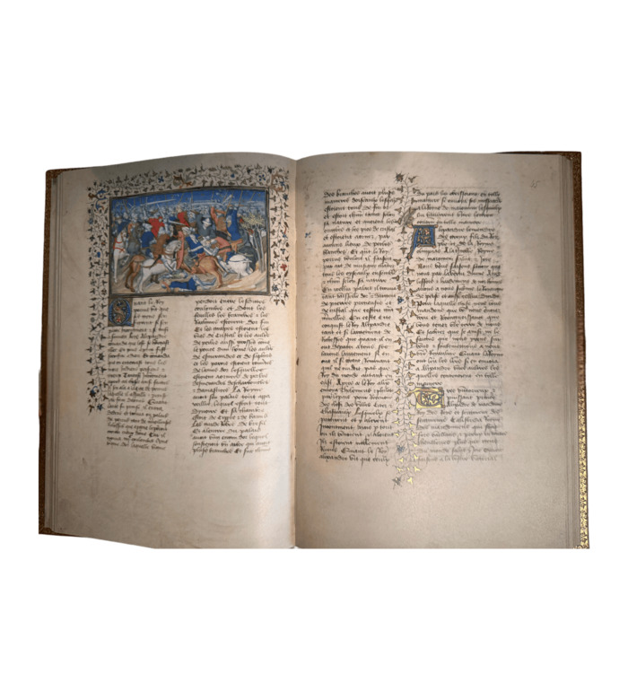 Der zwischen 1420 und 1425 entstandene Pariser Alexanderroman gehört zu den herausragenden Handschriften der französischen Spätgotik. In 86 Miniaturen und über hundert vergoldeten Initialen wird die Lebensgeschichte Alexanders des Großen in farbintensiven, detailreichen Szenen entfaltet. Der anonyme Buchmaler, bekannt als „Alexandermeister“, verband erzählerische Fantasie mit außergewöhnlicher Beobachtungsgabe: Landschaften, Städte, Tiere, höfische Feste und Kampfszenen erscheinen in leuchtender Farbigkeit und feiner Ausarbeitung.