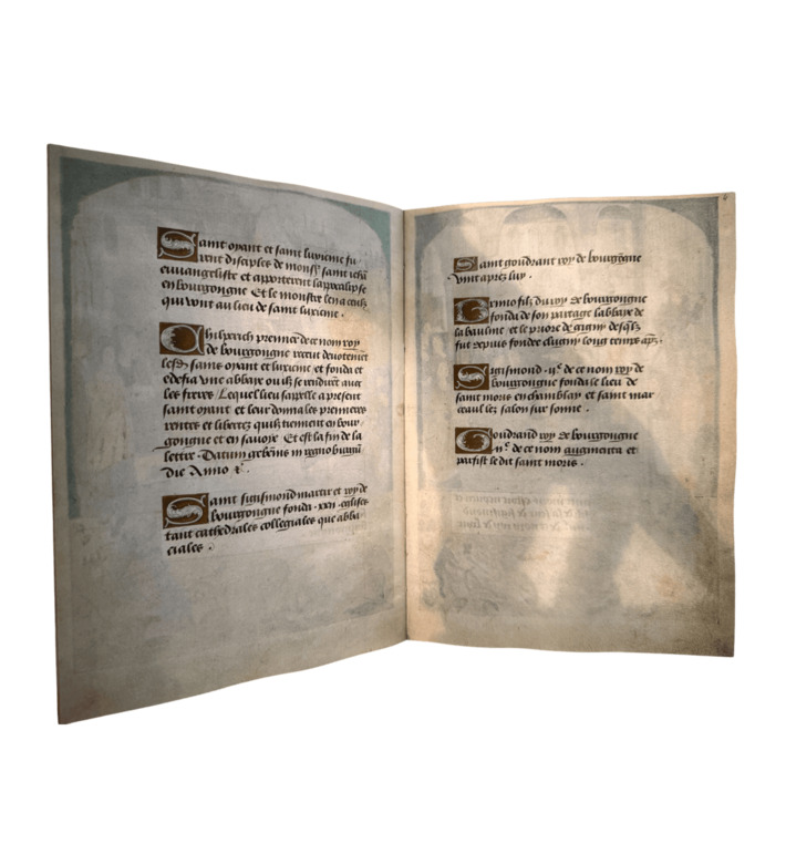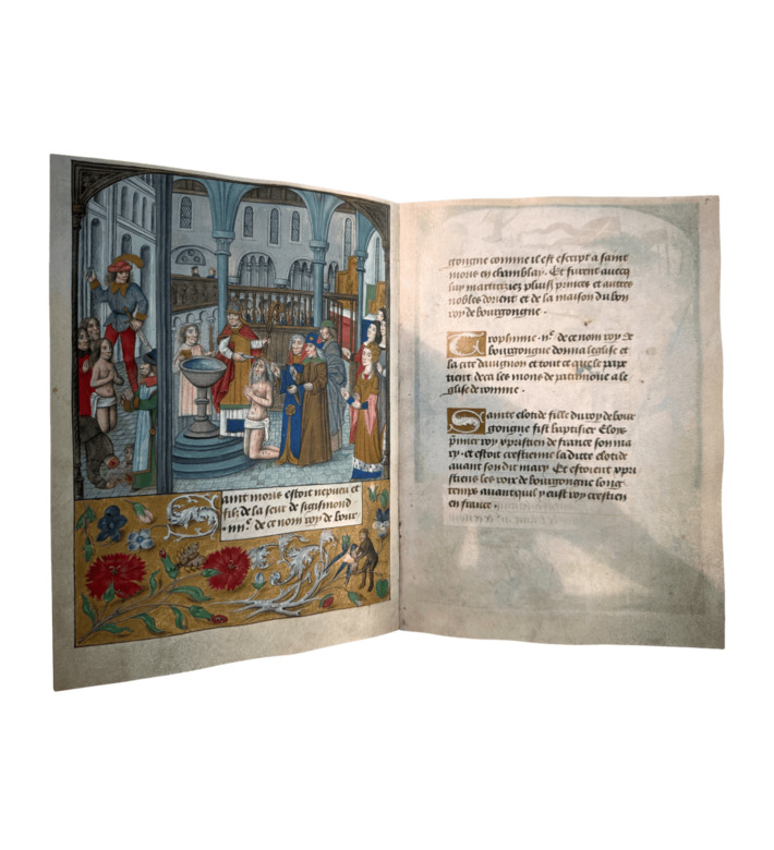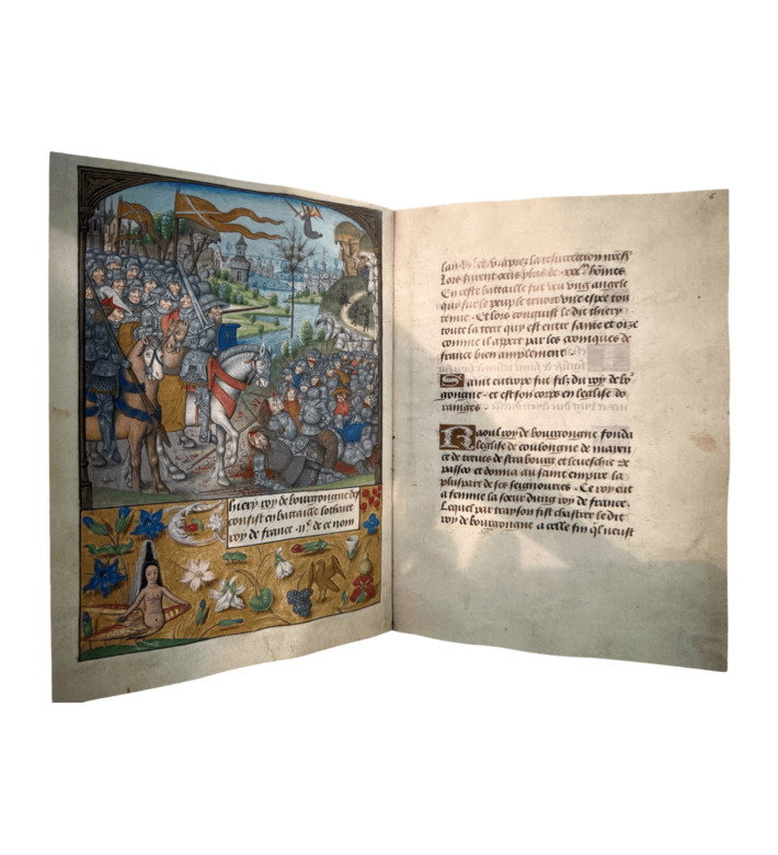 Elf ganzseitige Bilder mit begleitenden Texten zeigen Szenen aus der Geschichte des burgundischen Herzogtums – von Karl dem Großen bis zu den mythischen Anfängen des Hauses. Die Darstellungen verbinden höfische Eleganz mit erzählerischer Anschaulichkeit: Krönungen, Schlachten und Andachtsszenen entfalten sich vor flämischen Stadtlandschaften.