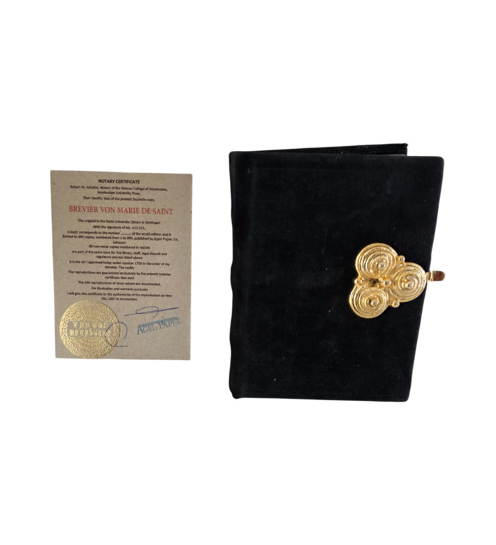 Das hier vorliegende Faksimile wurde in limitierter Auflage herausgegeben und mit größter Sorgfalt auf handgeschöpftem Papier reproduziert. Der Einband aus schwarzem Samt mit einer reich verzierten, goldfarbenen Schließe unterstreicht den exklusiven Charakter der Edition – ein Beispiel höchster Faksimilierungskunst und Ausdruck privater Andachtspraxis in der Renaissance.