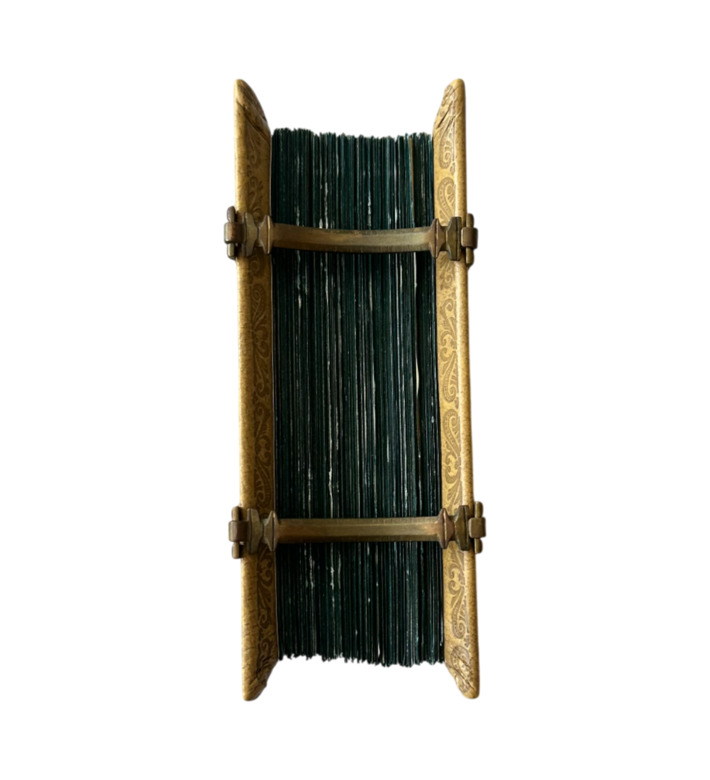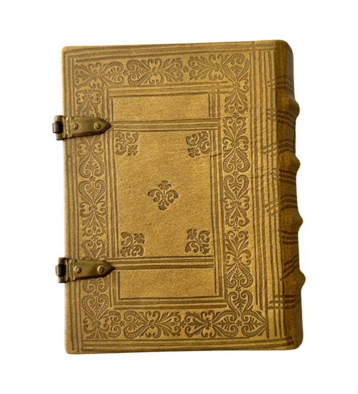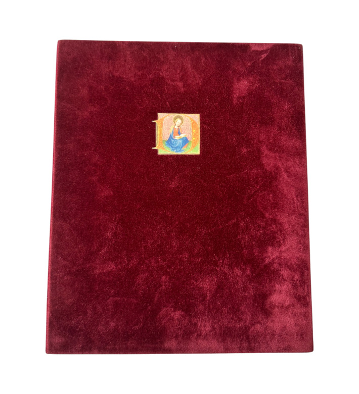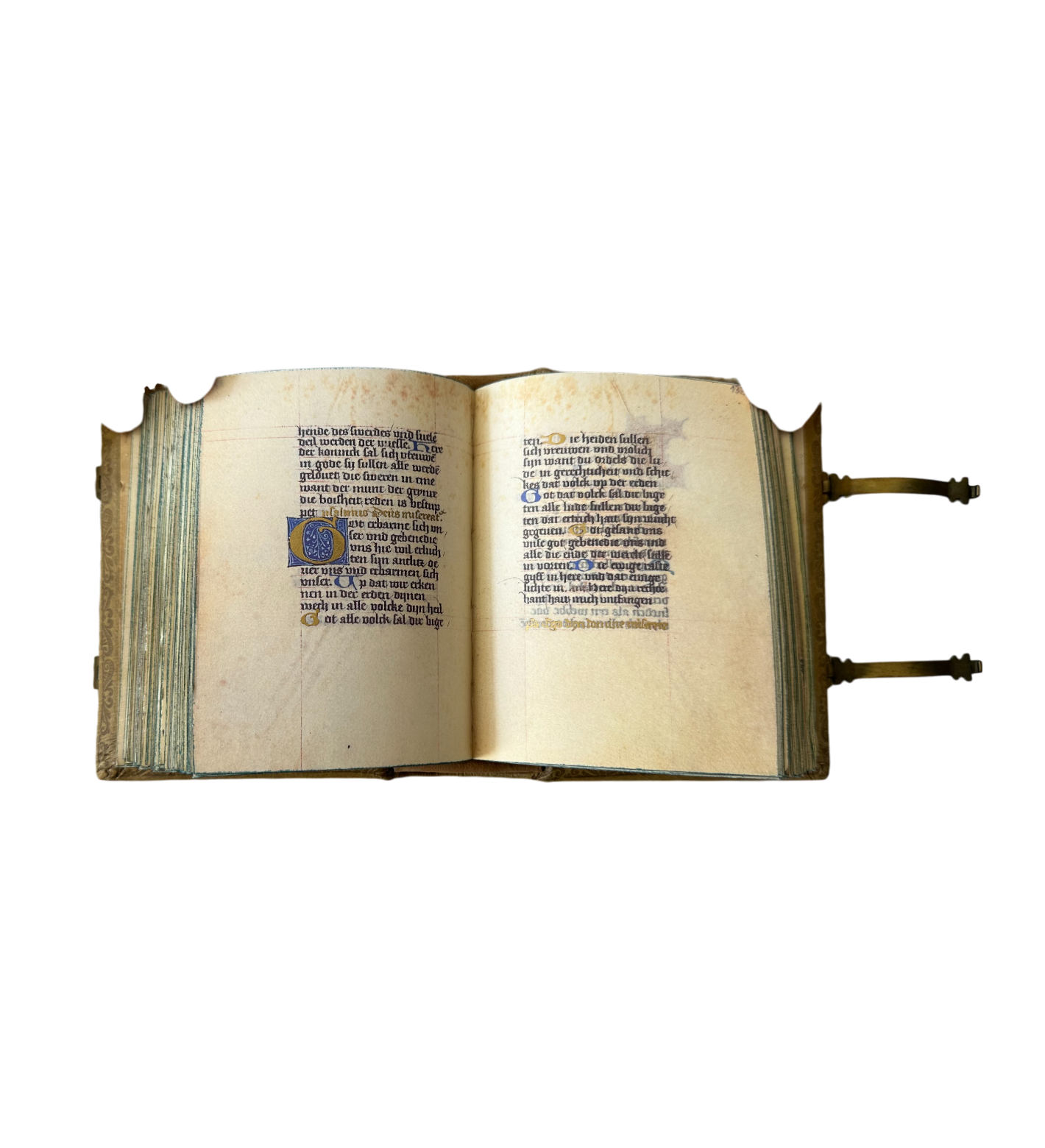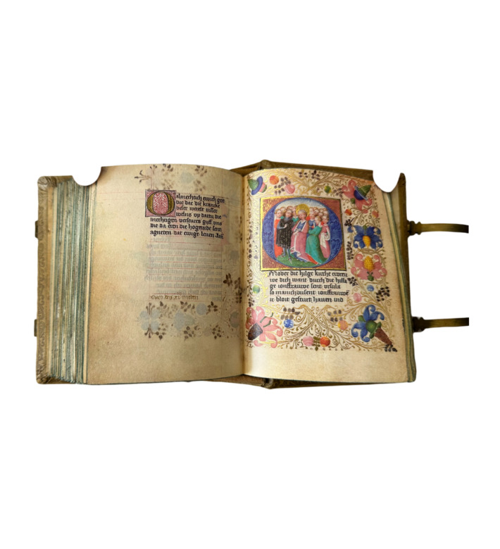 Der umfangreiche Codex umfasst 470 Seiten und beeindruckt durch 57 historisierte Initialen, die in fein nuancierten Farben und Blattgold ausgeführt sind. Die einzige ganzseitige Miniatur – eine anmutige Verkündigungsszene – bildet das visuelle Zentrum des Werks. Sie zeigt das intime Zwiegespräch zwischen Maria und dem Engel Gabriel und wird von üppigem Akanthus in sattem Blau, zarten Rosatönen und Goldornamenten eingefasst.