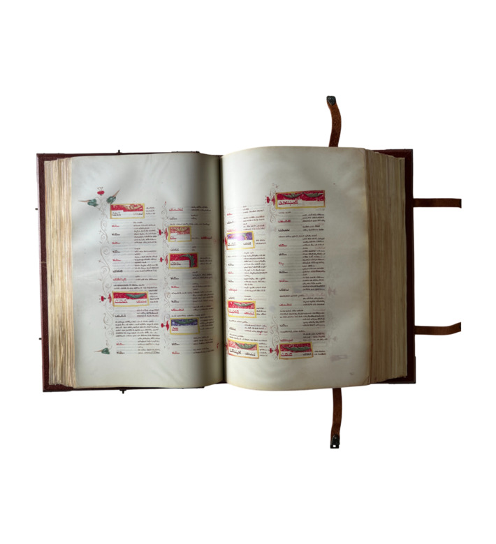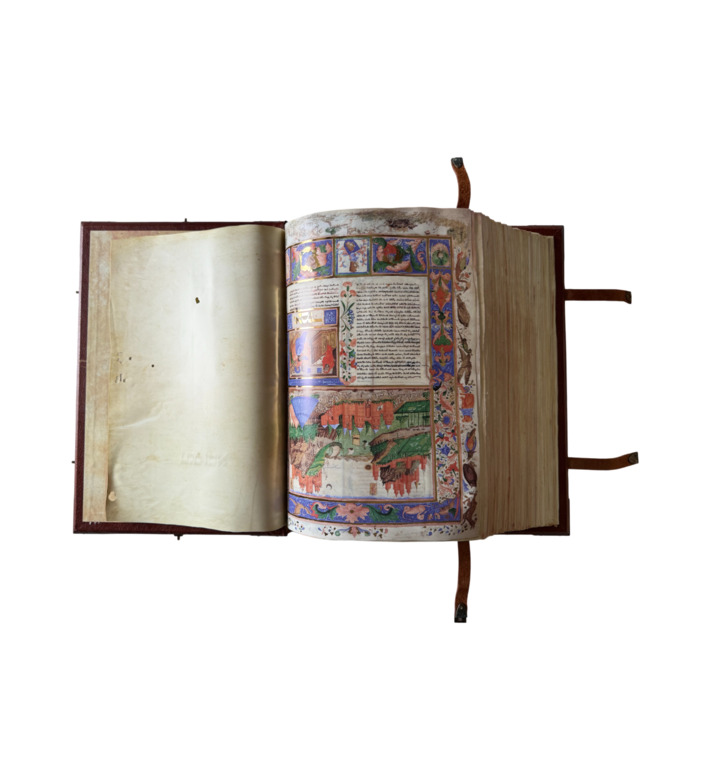 Die hier vorliegende Handschrift entstand um 1440 in Italien und überliefert die einzige vollständig erhaltene hebräische Übersetzung des Canon Medicinae von Natan ha-Meati. Der prachtvolle Codex aus der Schule von Ferrara umfasst über 1000 Seiten mit zehn ganzseitigen Miniaturen sowie hunderten Pflanzen- und Tierdarstellungen. Szenen aus Apotheke, Heilbädern und bäuerlichem Jahreslauf verbinden medizinisches Wissen mit reicher Bildwelt.