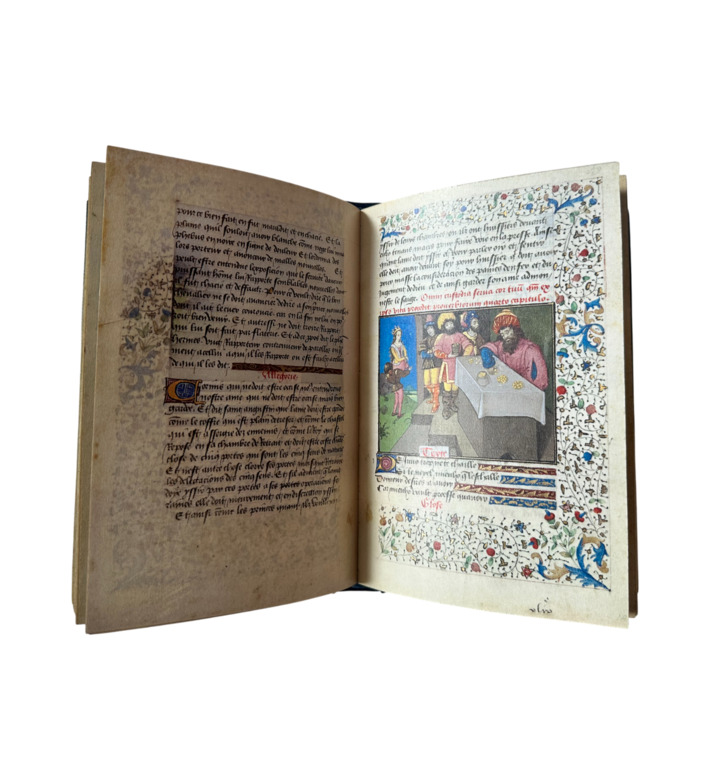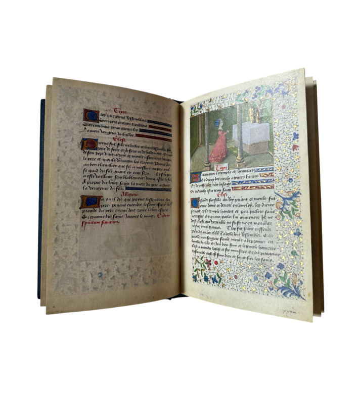 Die prachtvolle Ausstattung umfasst achtundneunzig Miniaturen von höchster Qualität. Feine Bordüren, vegetabile Ranken, goldene Initialen und leuchtende Farben bestimmen das Erscheinungsbild der Handschrift. Der anonyme Maler stand vermutlich in Verbindung mit Künstlern aus dem Umfeld von Barthelemy d Eyck und Jean Fouquet.