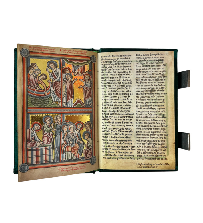 Die sogenannte Illustrierte Bibel von Den Haag entstand im späten 12. Jahrhundert in der Benediktinerabtei St. Bertin in Saint-Omer und gilt als eines der frühesten vollständig bebilderten biblischen Manuskripte Westeuropas. Der lateinisch-französische Text wird von 172 Miniaturen begleitet, darunter 45 ganzseitige Darstellungen, die Szenen aus dem Alten und Neuen Testament sowie Heiligenviten zeigen.