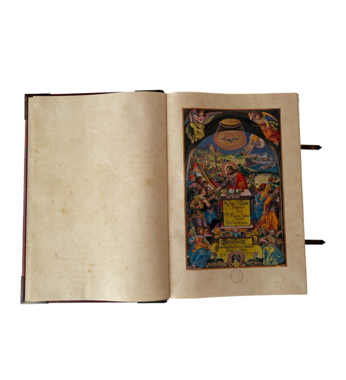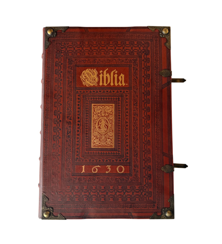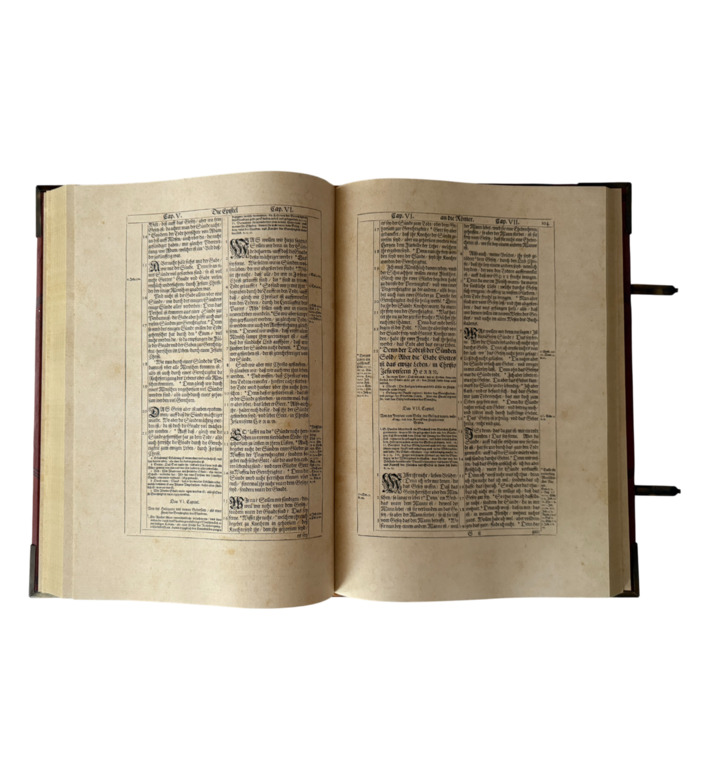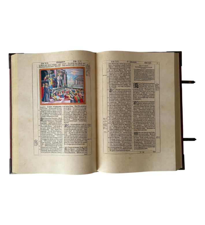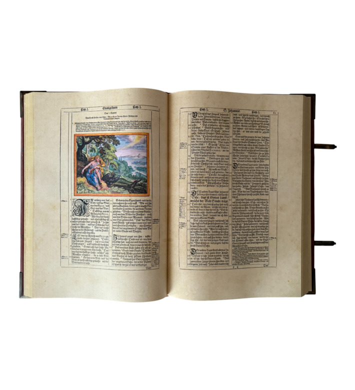 Das prachtvolle Werk erschien bei den Erben des Straßburger Druckers Lazarus Zetzner. Mit Goldschnitt, Lederband, Metallschließen und reicher Prägung ausgestattet, gehört die „Kupferbibel“ zu den begehrtesten Bibelausgaben der Frühen Neuzeit und ist ein Meilenstein barocker Buchkunst.