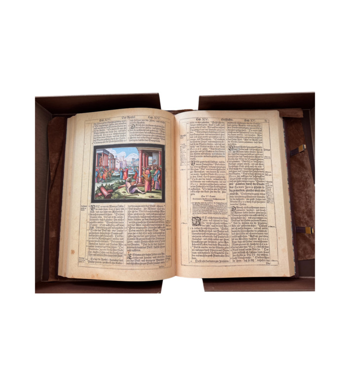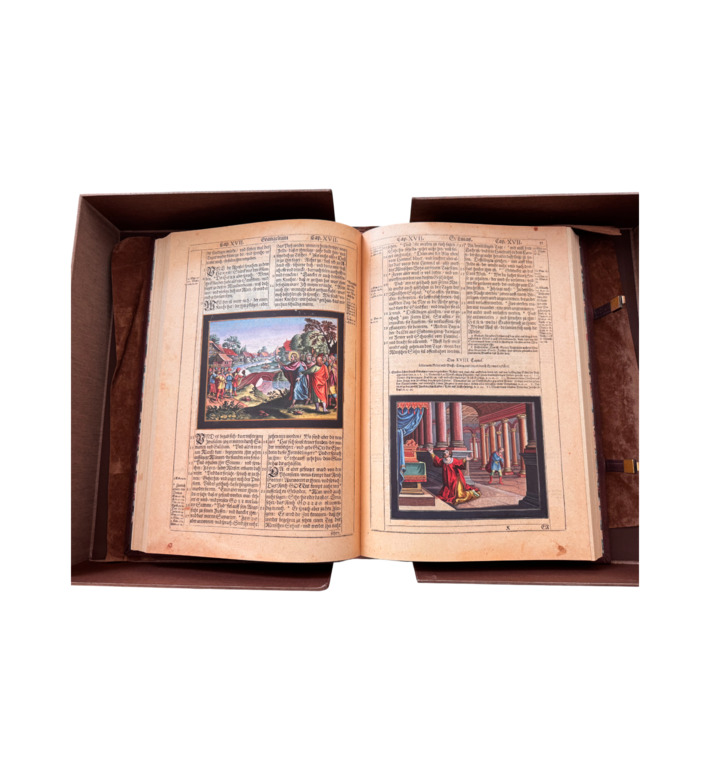Das prachtvolle Werk erschien bei den Erben des Straßburger Druckers Lazarus Zetzner. Mit Goldschnitt, Lederband, Metallschließen und reicher Prägung ausgestattet, gehört die „Kupferbibel“ zu den begehrtesten Bibelausgaben der Frühen Neuzeit und ist ein Meilenstein barocker Buchkunst.