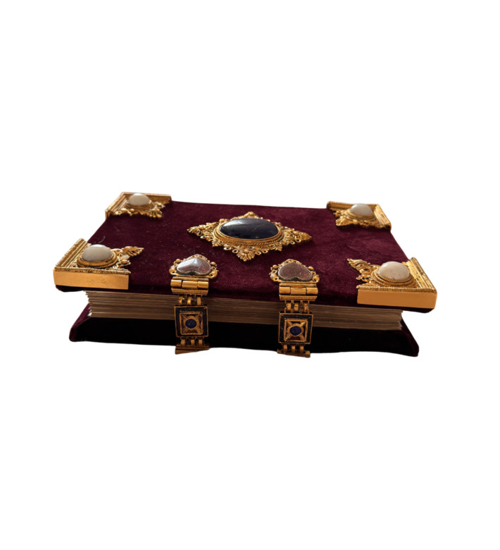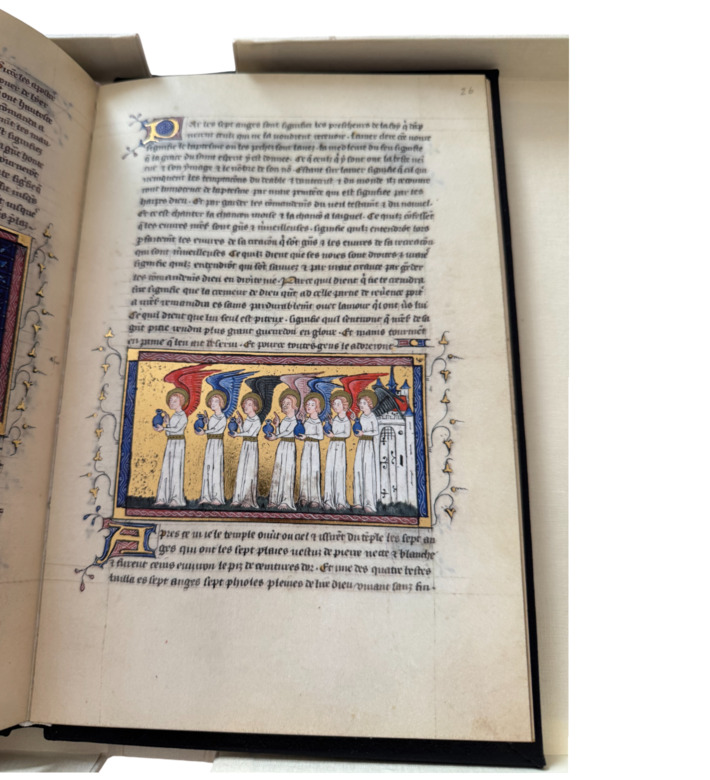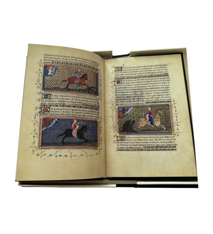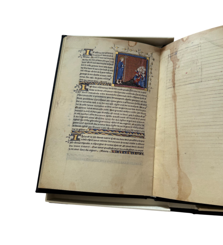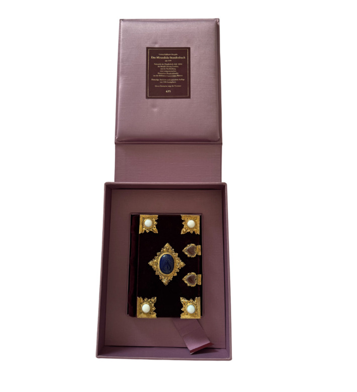 Auf 228 Seiten entfaltet sich eine reiche Bildausstattung: vier ganzseitige und sieben kleinere Miniaturen, ein Kalender mit Monats- und Tierkreiszeichen, über 120 kunstvoll gestaltete Initialen sowie ornamentale Bordüren mit Vögeln, Tieren und figürlichen Szenen. Besonders eindrucksvoll ist die ikonographische Spannweite von der Verkündigung bis hin zur eindringlichen Darstellung des Todes, die in detailreichen Innenräumen und mit üppigem Goldauftrag gestaltet sind.