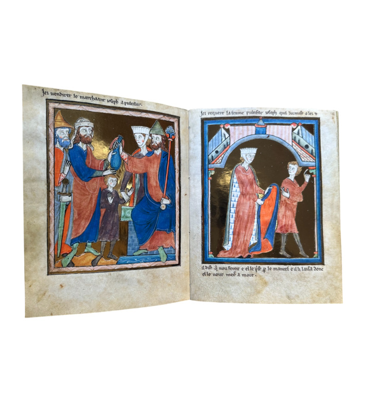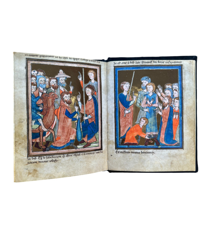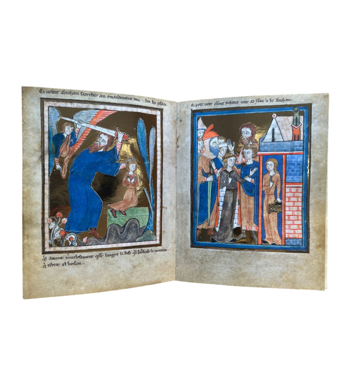 Die Handschrift ist reich mit Gold, Lapislazuli und Purpurfarben ausgestattet und zeigt in ihren Miniaturen die charakteristische Klarheit und Symmetrie der Pariser Buchmalerschulen des 13. Jahrhunderts. Zahlreiche Initialen, ornamentale Bordüren und figurenreiche Szenen veranschaulichen die Schöpfung, das Leben Christi und zentrale alttestamentliche Erzählungen.