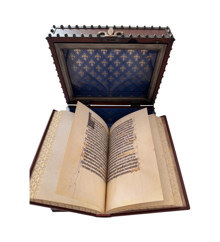 Die Handschrift umfasst 384 Seiten auf Pergament mit 27 ganzseitigen Miniaturen, 24 Kalendermedaillons und neun vergoldeten Initialen. Jede Seite ist in leuchtende Farben und schimmerndes Blattgold getaucht. Die Darstellungen erinnern in ihrer Strahlkraft und Komposition an die Glasfenster der französischen Kathedralen, während ornamentale Drôlerien und Tierfiguren die Ränder beleben.