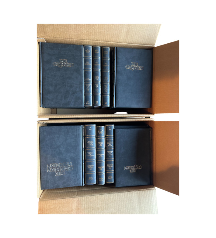 Die dunkelbraunen Ledereinbände mit goldgeprägter Krone verleihen der Edition einen repräsentativen Charakter, wie ihn der Coron Verlag für seine großformatigen Sammlungswerke charakteristisch pflegte.